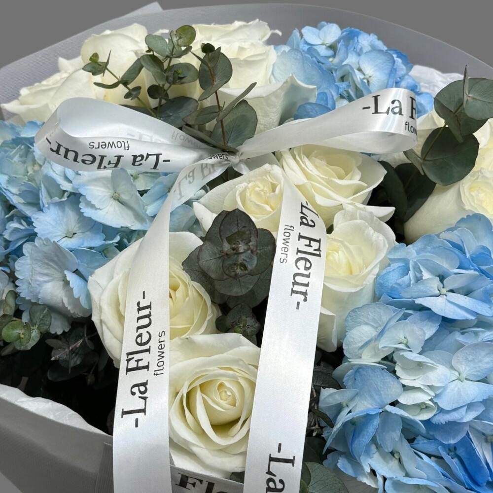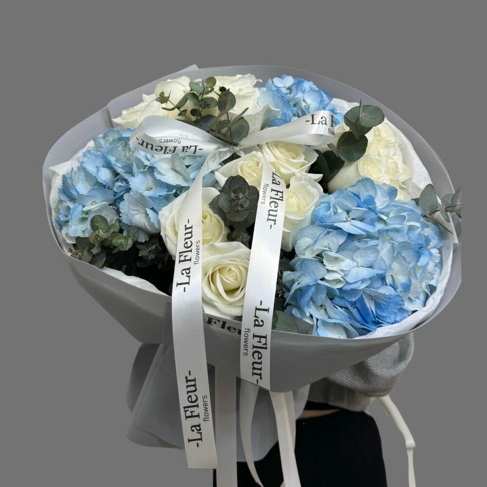 Гортензия - 3 дана Эвкалипт - 1 дана розы 50 см - 18 дана аква бумага - 1 дана