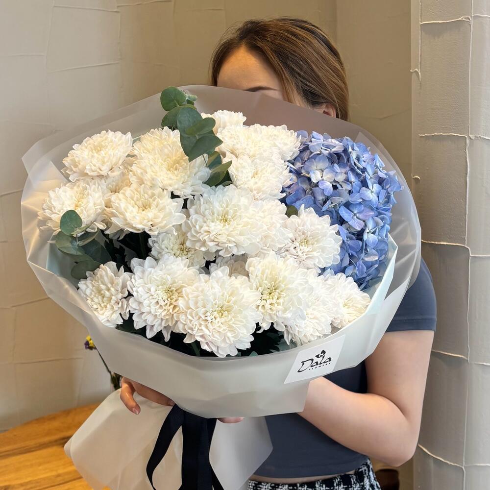 Нежный букет из белых хризантем и голубой гортензии — воплощение чистоты и спокойствия. Элегантный подарок с легкой ноткой свежести.