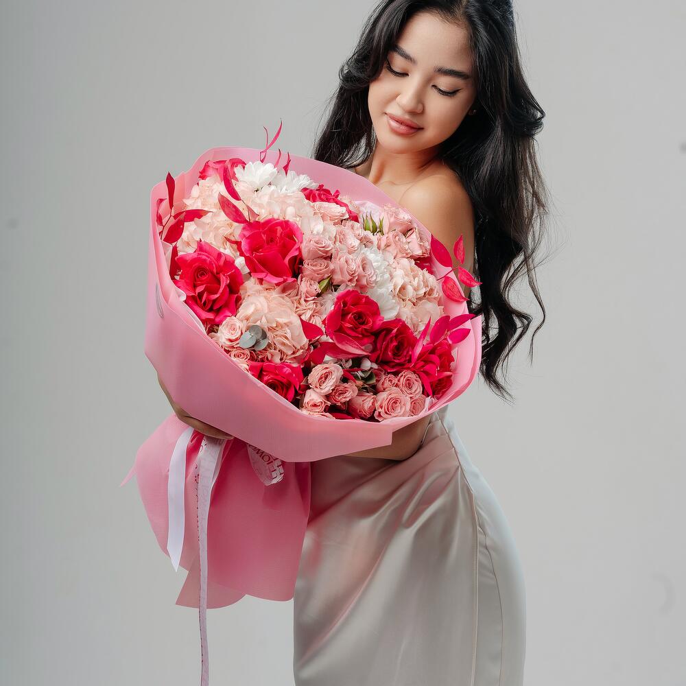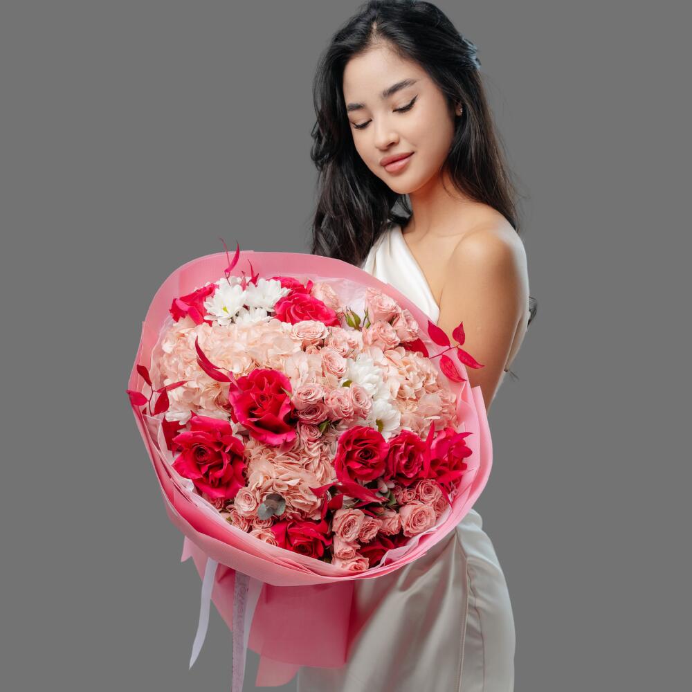 Гортензия - 5 дана Рускус - 5 дана Эвкалипт - 1 дана Хризантема - 5 дана раушан - 11 дана бұта раушандары - 7 дана аква бумага - 1 дана