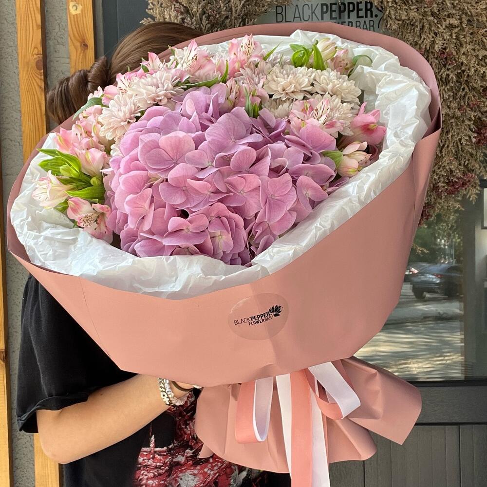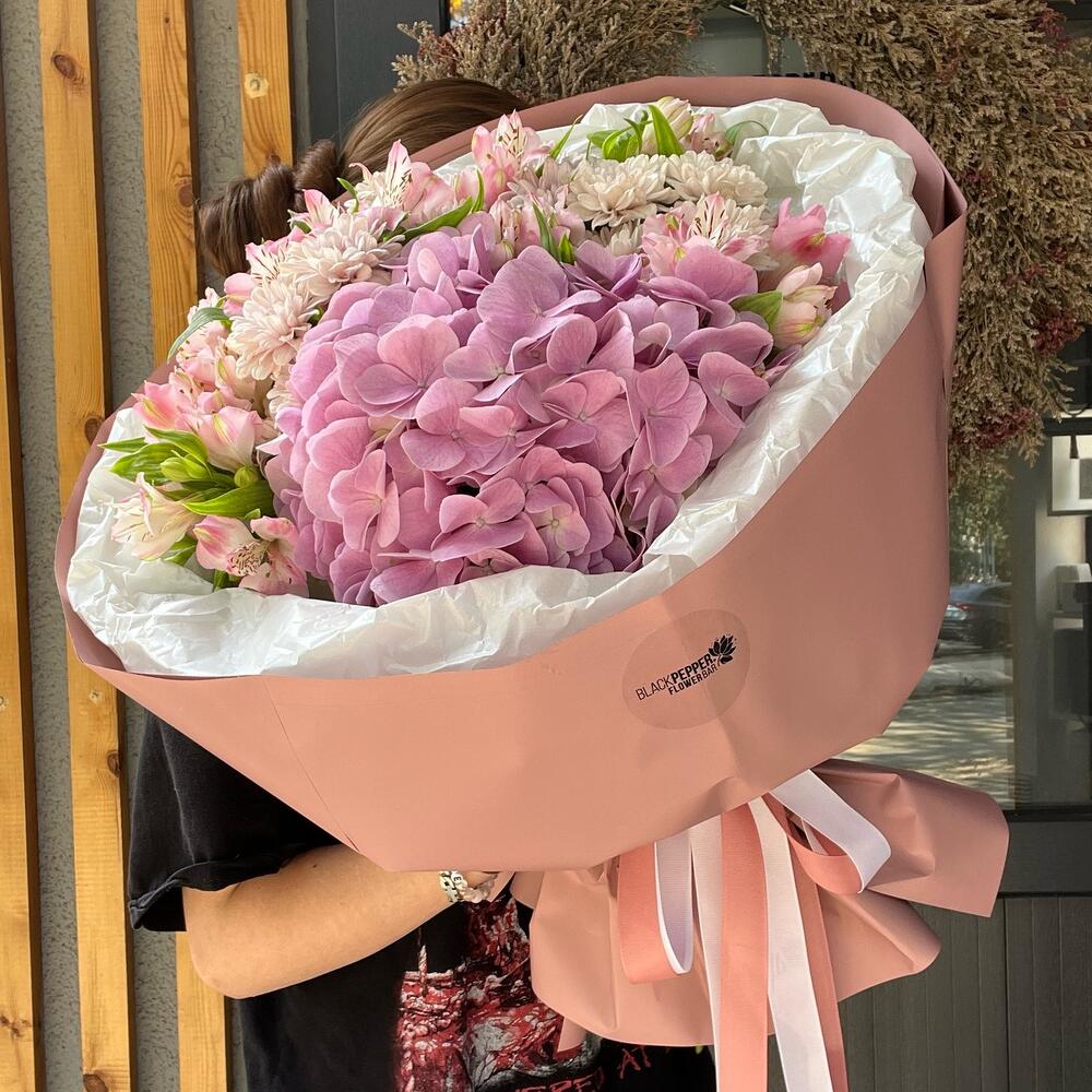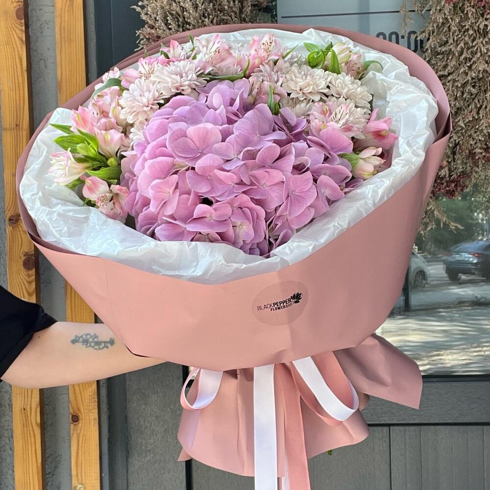 Альстроэмерия - 8 дана Гортензия - 1 дана Хризантема бұтасы - 2 дана