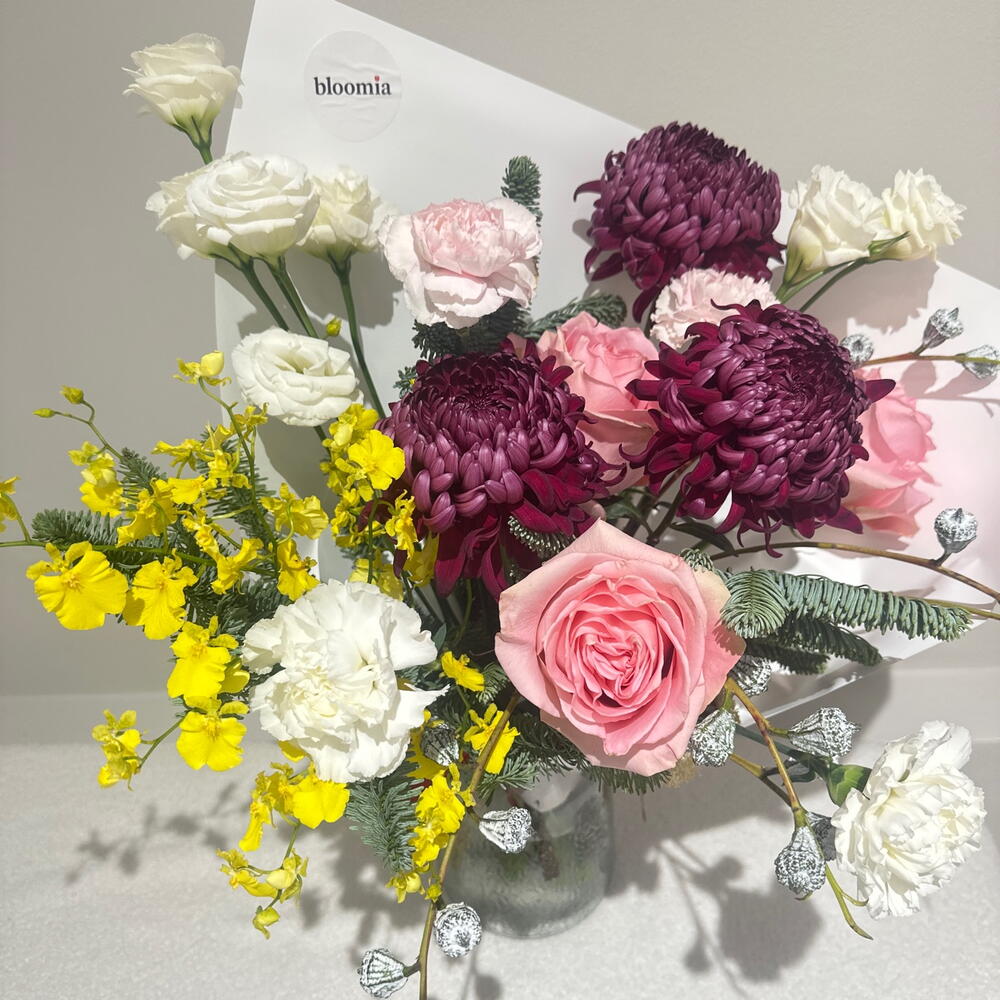 Нобилис - 3 дана Диантус розовый - 2 дана эустома белая - 3 дана диантус белый сортовой - 2 дана переноска для цветов - 1 дана плоды эвкалипта - 3 дана онцидиум - 1 дана хризантема бордовая бигуди - 3 дана