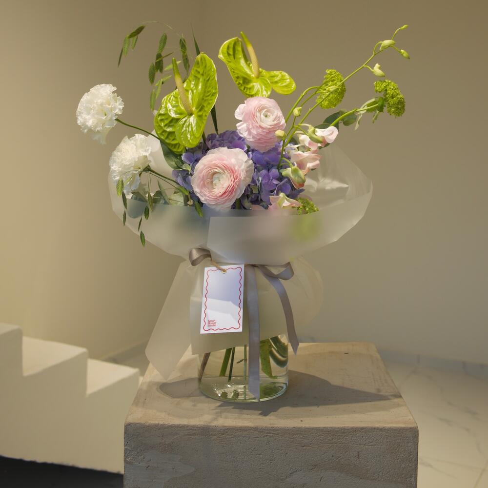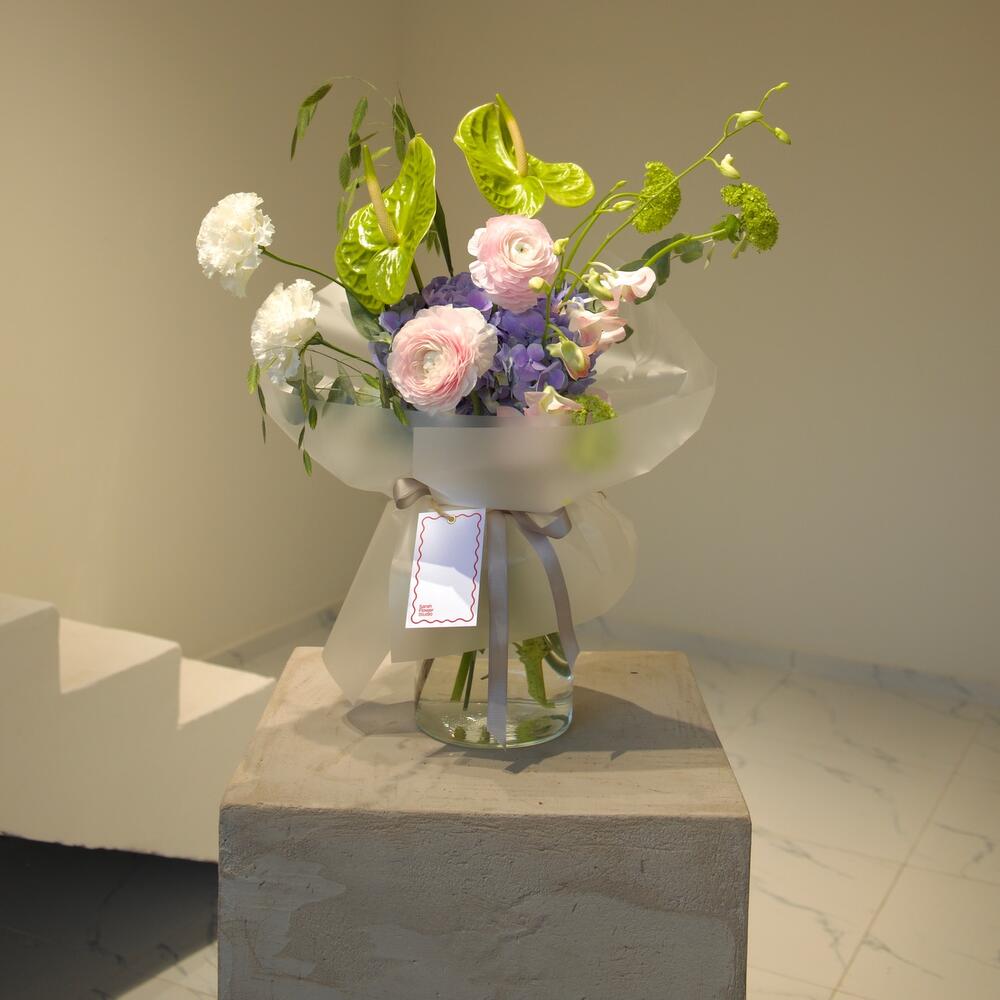 Антуриум - 2 дана Вибурнум - 3 дана Гортензия - 1 дана Ранункулюс - 2 дана орхидея - 1 дана эустома белая - 2 дана
