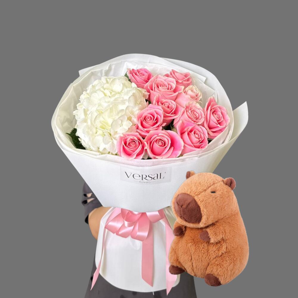 Нежный букет из 11 пудрово-розовых роз и белоснежной гортензии — символ заботы и любви. А милая мягкая игрушка капибара добавляет изюминку и делает подарок запоминающимся. Идеально для романтичного признания, дня рождения или просто для того, чтобы поднять настроение.