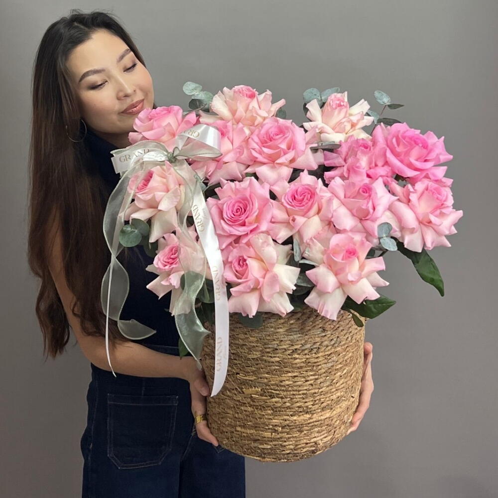 Гүл құмырасы - 1 дана Флористикалық Оазис - 3 дана сәби эвкалипт - 3 дана мандала ішкі жағы сыртқа шығарылған раушан - 15 дана