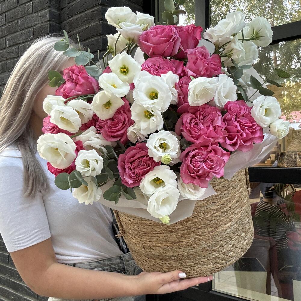 Лизиантус - 7 дана Эвкалипт - 1 дана Кашпо - 1 дана Пионовидная роза - 15 дана