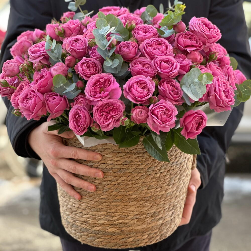 Эвкалипт - 9 дана Кашпо - 1 дана пионовидные спрей розы - 20 дана