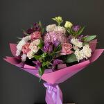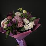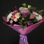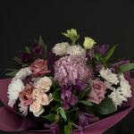 Альстроэмерия - 3 дана Гортензия - 1 дана Лизиантус - 1 дана Писташ - 1 дана Хризантема бұтасы - 2 дана Роза одноголовая - 3 дана Ашықхат - 1 дана Дизайн күңгірт пленка - 1 дана Спрей роза - 1 дана