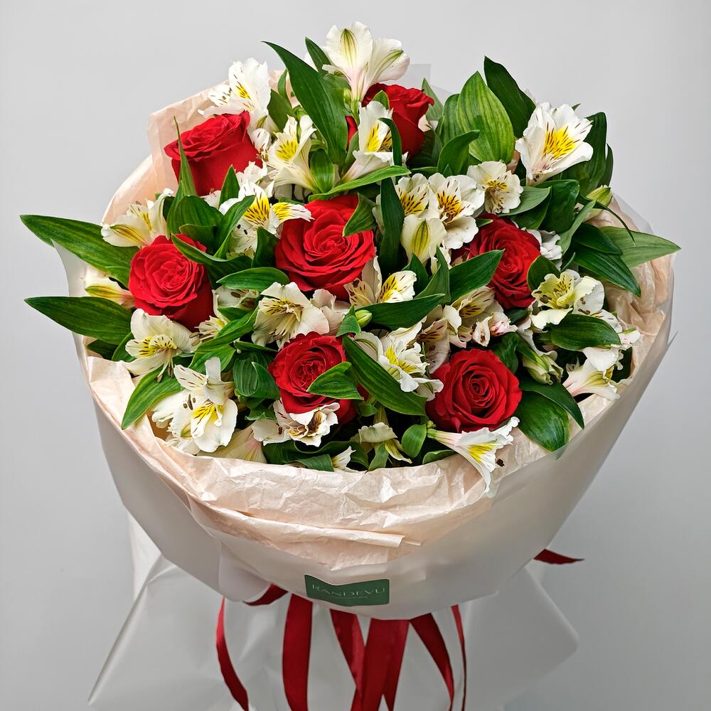 Эта композиция объединяет алые розы — символ страсти и любви, с утончёнными белыми альстромериями, олицетворяющими нежность и изящество. Сочные зелёные акценты придают букету свежесть и гармонию. Упаковка в кремовых тонах подчёркивает элегантность и универсальность букета, делая его идеальным подарком для любого значимого случая.