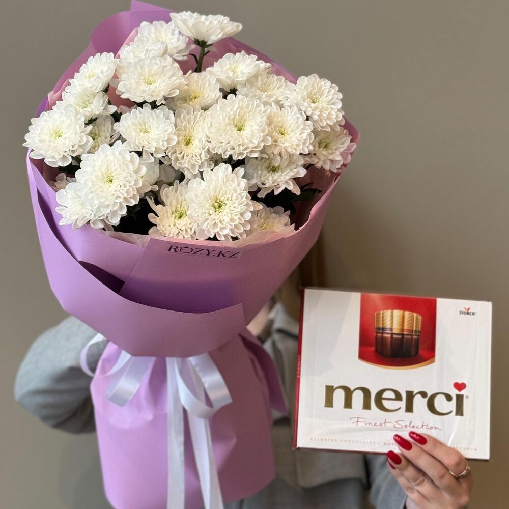 Хризантема бұтасы - 5 дана Дизайнерлік қаптама - 4 дана Мерси шоколад - 250 гр.