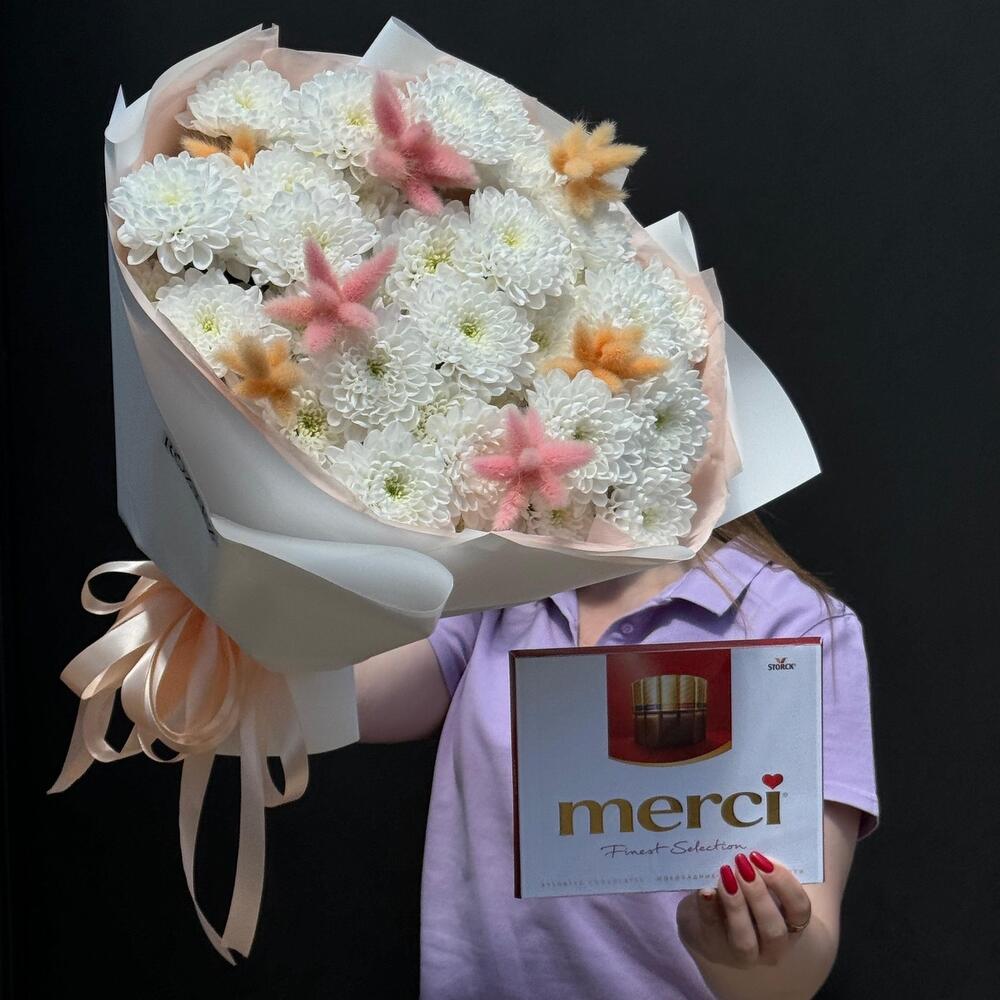Хризантема бұтасы - 7 дана Дизайнерлік қаптама - 5 дана Мерси шоколад - 250 гр. лагурус (сухоцвет) пучок - 7 дана