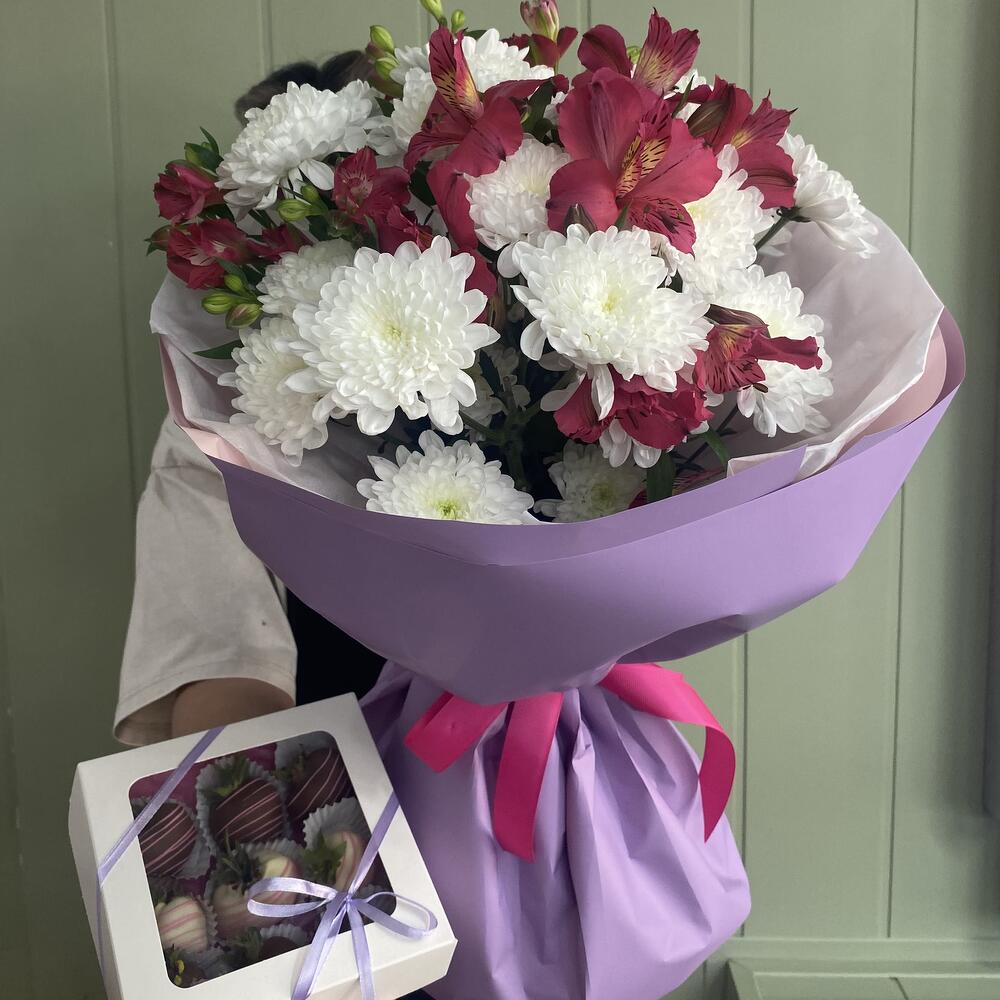 Альстроэмерия - 3 дана Хризантема бұтасы - 3 дана клубника в шоколаде callebaut - 1 дана