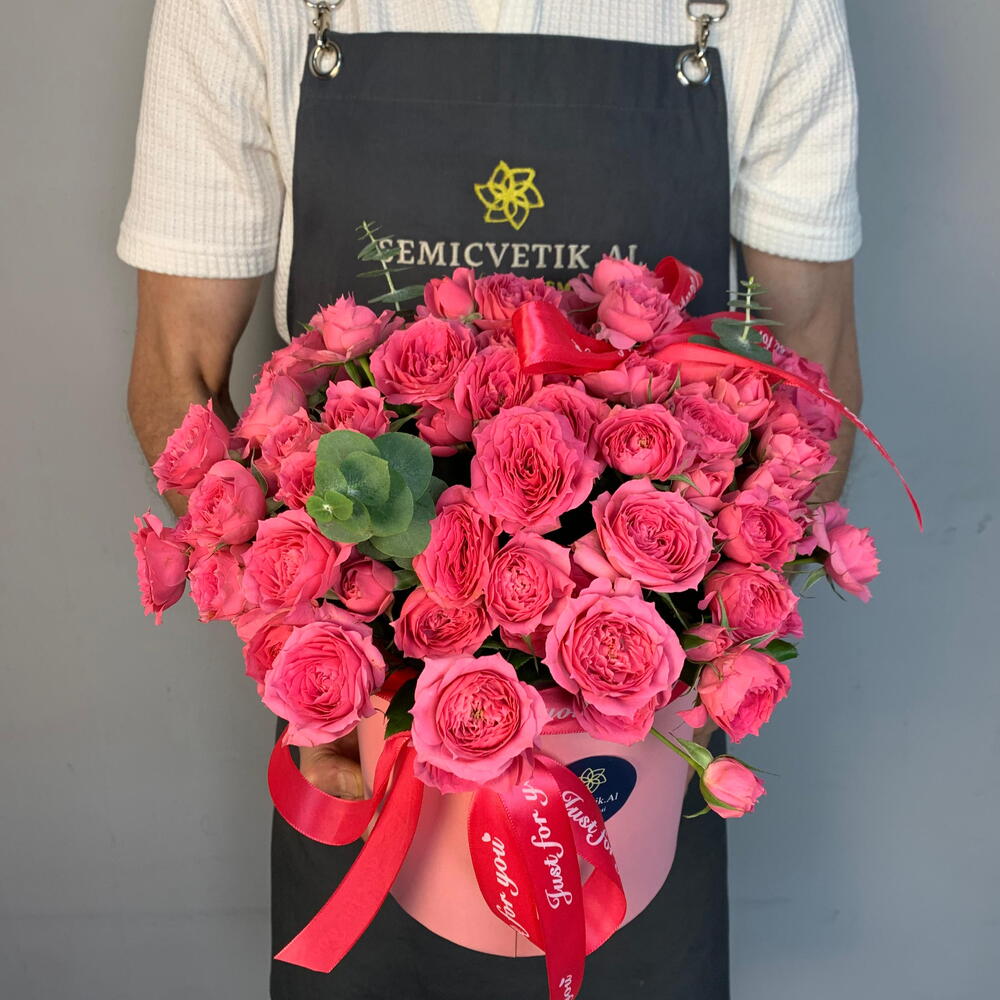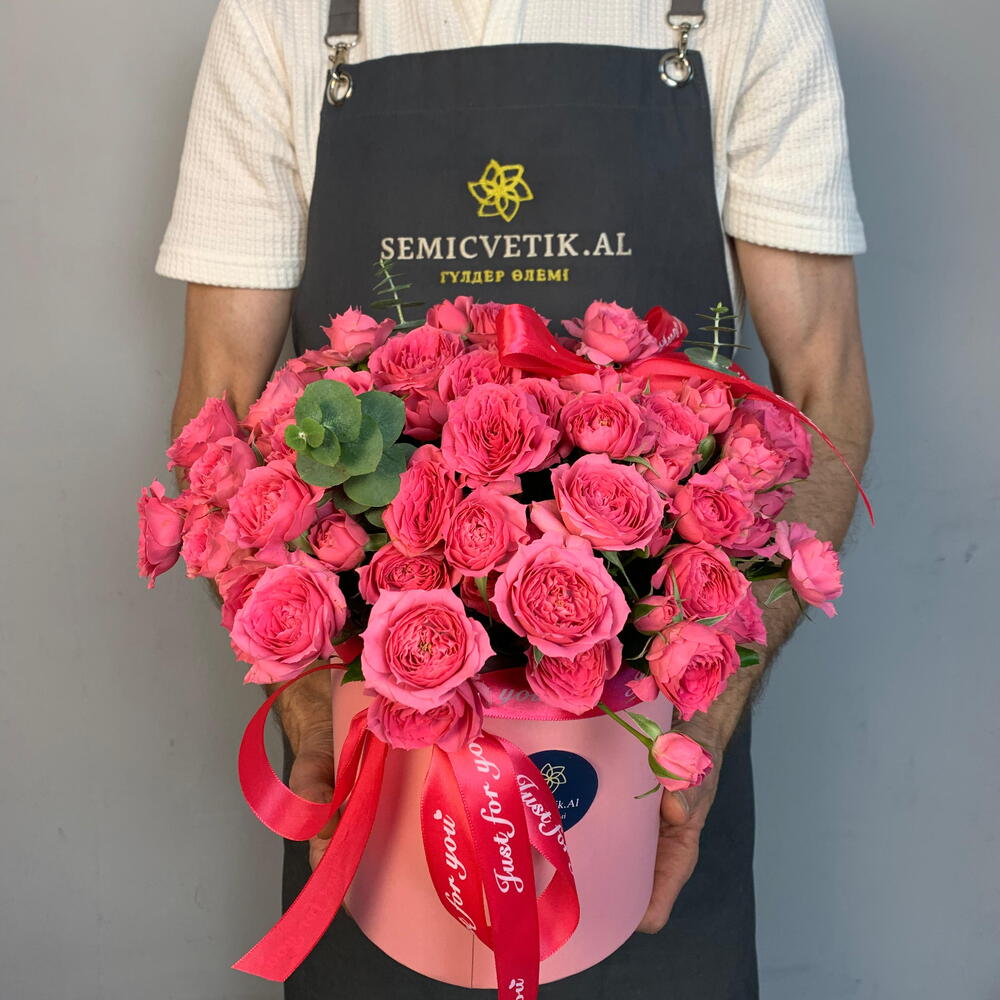 Роза кустовая розовая - 6 дана Гүлді губка - 1 дана Коробка розовая - 1 дана лента репсовая розовая - 1 дана эвкалипт бэбиблю - 1 дана