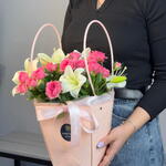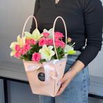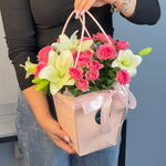 🌸 Букет-сумочка “Розовый Шарм” 🌸 Пионовидные розовые кустовые розы 🌹 и изысканные лилии 🤍 собраны в нежно-розовую сумочку 🎀. Компактный, но очень эффектный букет, который выглядит стильно и современно. Идеальный вариант, чтобы удивить и порадовать любимого человека 💝✨
