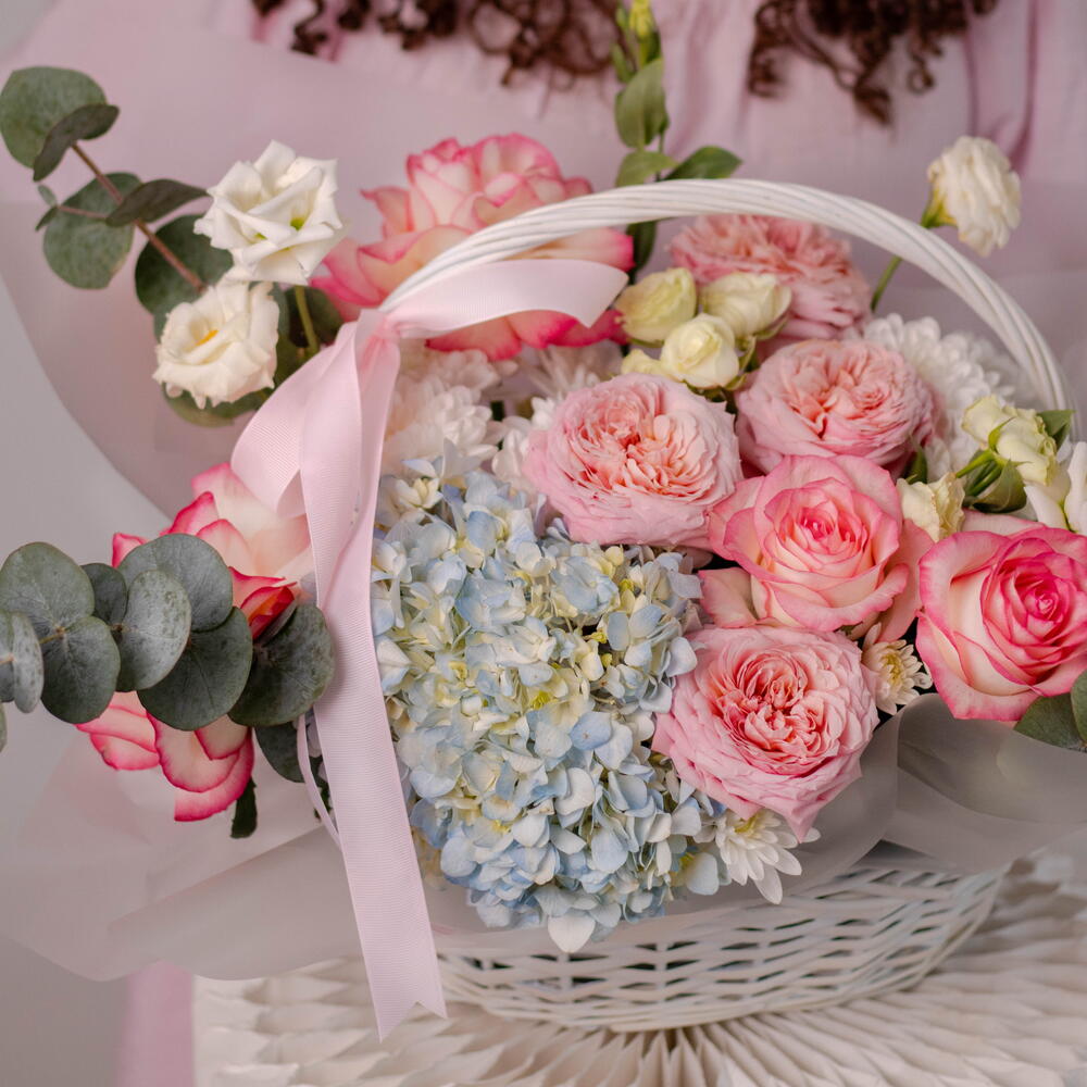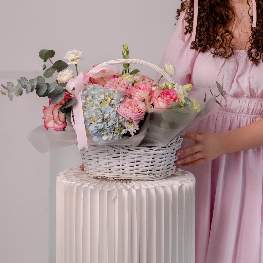 Бұта раушаны - 2 дана Эвкалипт - 1 дана Эустома - 3 дана Қызғылт раушан - 4 дана Ақ бұталы хризантема - 2 дана Көк гортензия - 1 дана Гүлді губка - 2 дана лента нәзік-қызғылт - 1 дана себет 30см - 1 дана маттық жартылай мөлдір аквақағаз - 2 дана