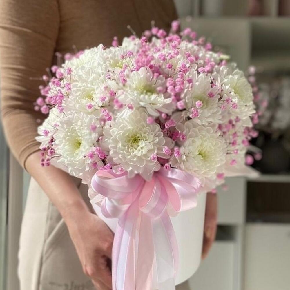 Белое облако— это изысканный и воздушный букет, сочетающий белоснежные хризантемы и нежные розовые акценты гипсофилы. Оформленный в элегантной шляпной коробке и украшенный атласными лентами, он выглядит утончённо и стильно. Идеальный выбор для поздравления, благодарности или просто знака внимания, который подарит радость и тепло.