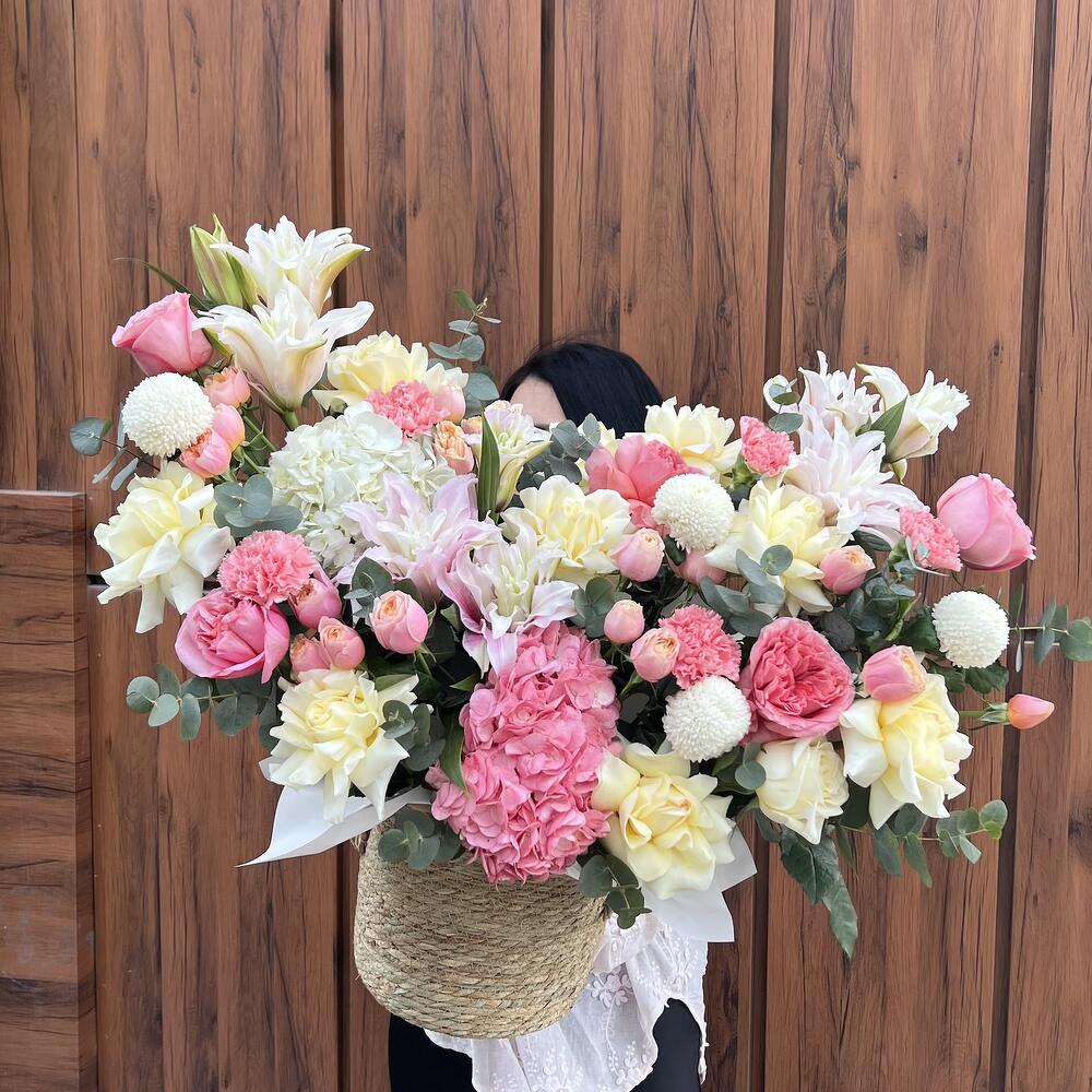 Гортензия - 2 дана Лилия - 3 дана Эвкалипт - 2 дана Раушан - 15 дана Гвоздика - 5 дана Спрей - 5 дана Хризантема одноголовая белая - 5 дана Флористикалық Оазис - 2 дана кашпо m - 1 дана