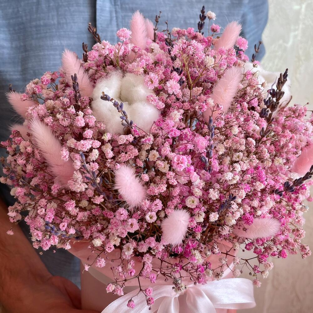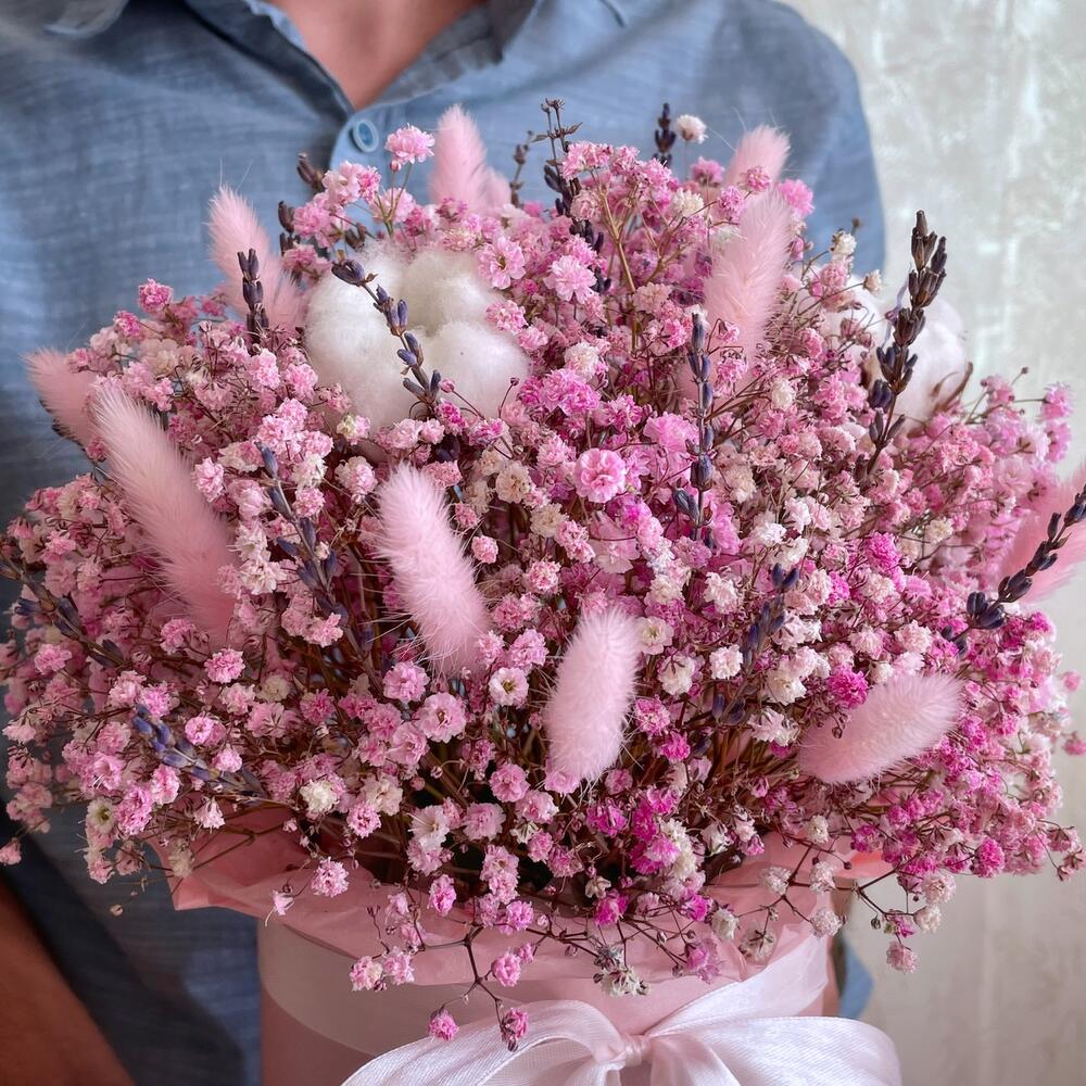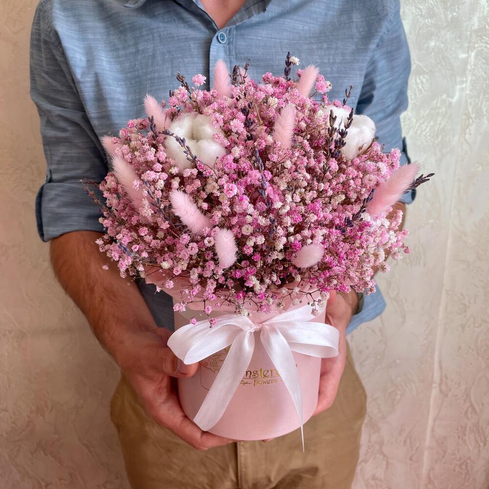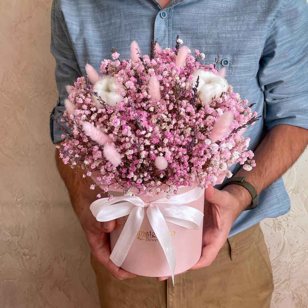 Композиция из сухоцветов - это отличный подарок по любому случаю. Такой букет будет радовать не один месяц и даже не один год! Это такие же цветы, как обычные живые, но специальным образом высушенные и аккуратно собранные в композицию. Сухоцветы не требуют специального ухода, только нежного обращения, ведь они сухие и их легко повредить. Такой букет удивит вашу Получательницу и подарит прекрасные эмоции надолго!
