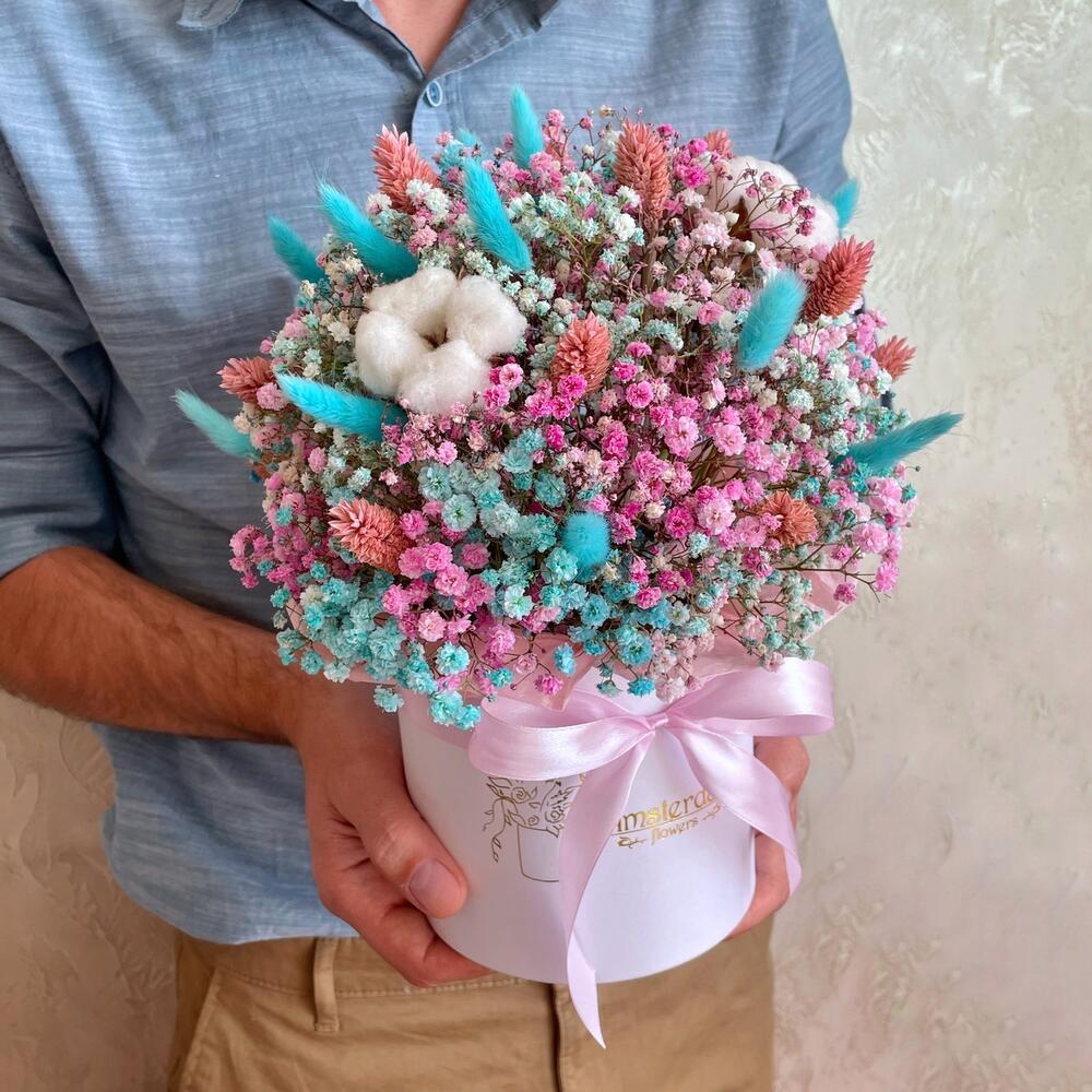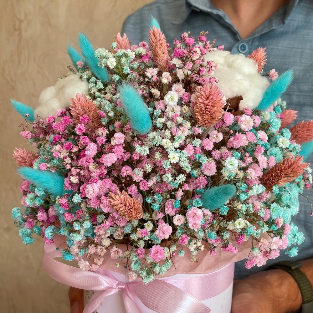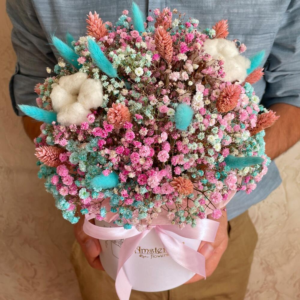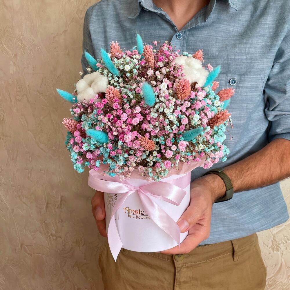 Атласты таспа - 1 дана Лагурус (кептірілген гүл) - 15 дана Хлопок (сухоцвет) - 3 дана Оазис сухой - 1 дана Коробка d15 - 1 дана гипсофила (сухоцвет) - 7 дана фаларис (сухоцвет) - 15 дана