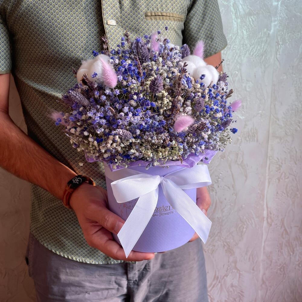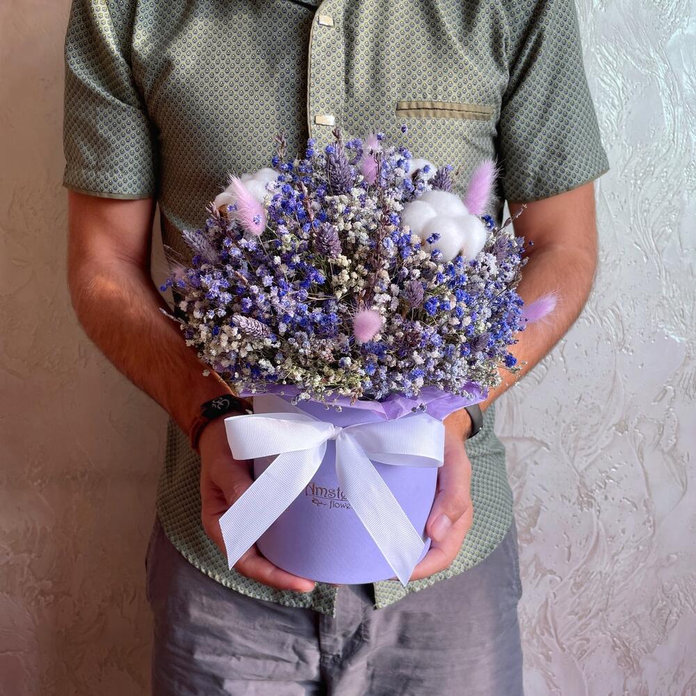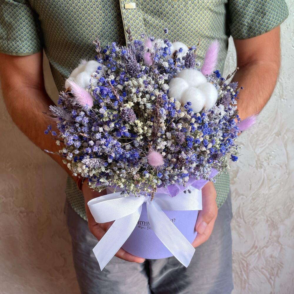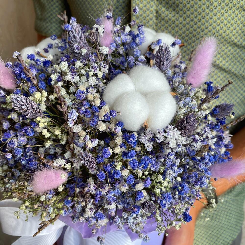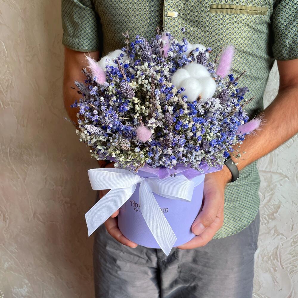 Лаванда (кептірілген гүл) - 11 дана Лагурус (кептірілген гүл) - 5 дана Хлопок (сухоцвет) - 3 дана Оазис сухой - 1 дана Коробка d15 - 1 дана гипсофила (сухоцвет) - 7 дана фаларис (сухоцвет) - 15 дана