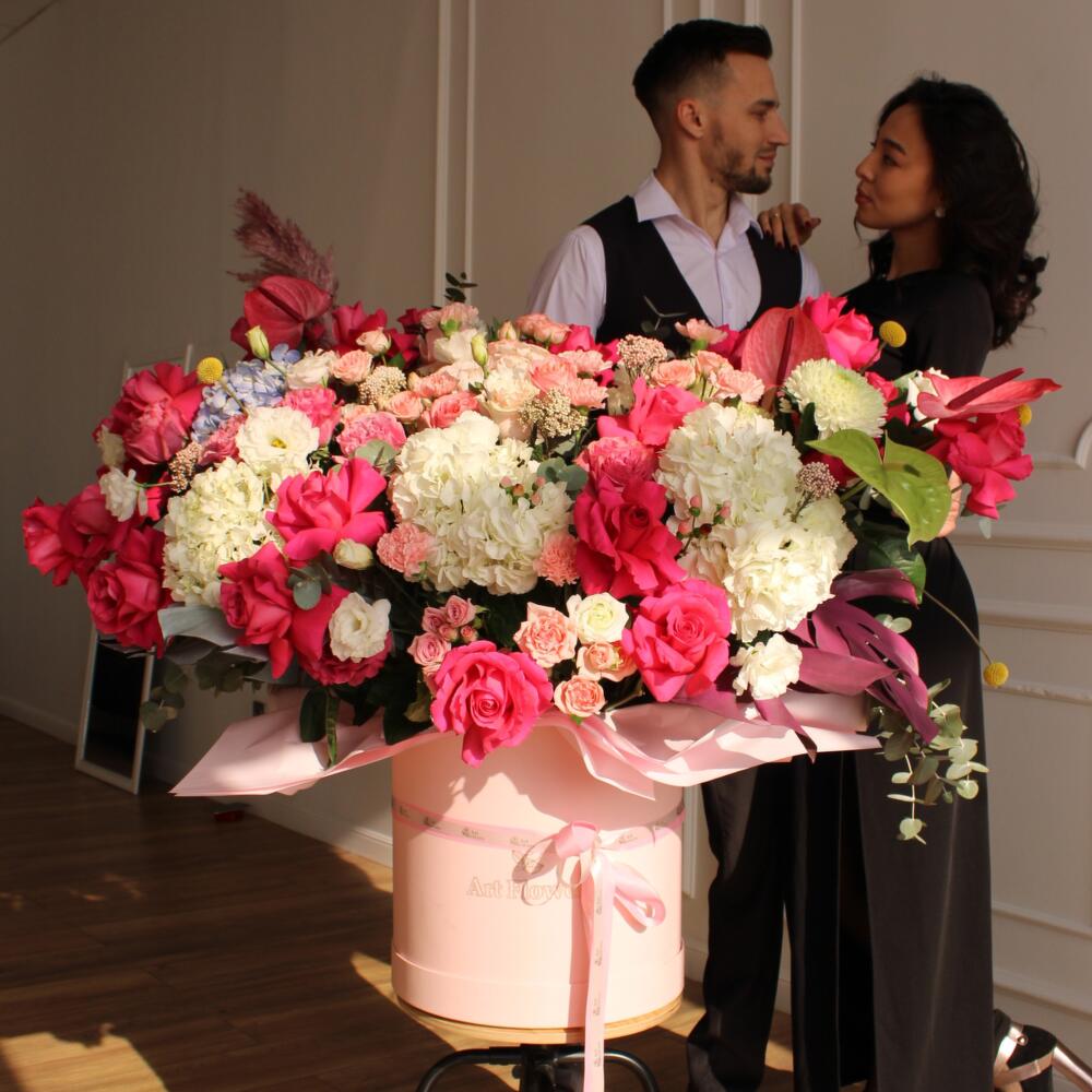 Антуриум - 5 дана Гортензия - 9 дана Лизиантус - 11 дана Эвкалипт - 10 дана Бұта раушаны - 11 дана Қорап - 1 дана Роза 50 см - 35 дана аква бумага - 2 дана