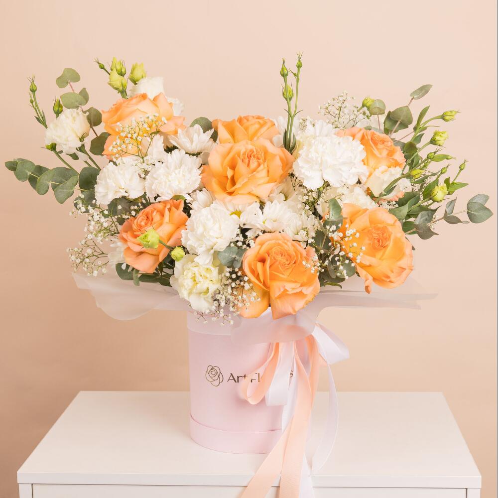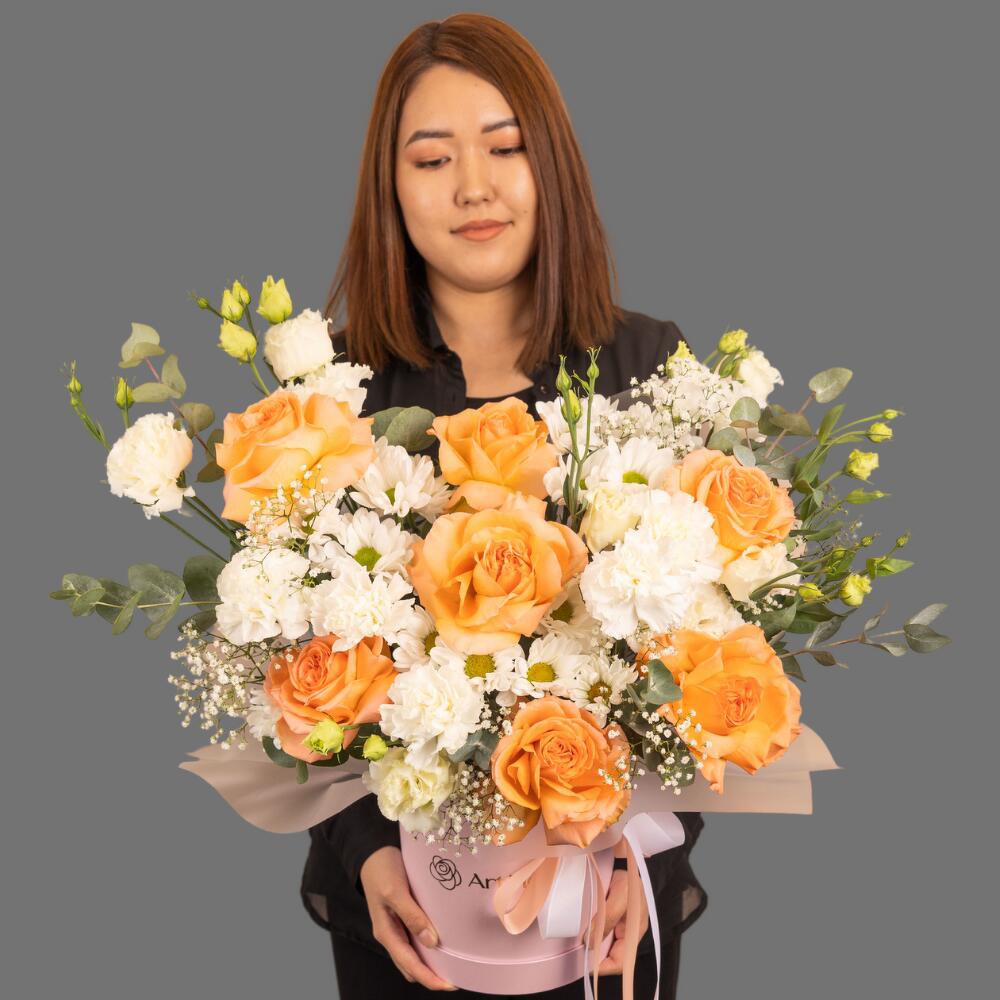 Гипсофила - 1 дана Лизиантус - 2 дана Эвкалипт - 2 дана Раушан - 7 дана Бұталы хризантема - 3 дана Гвоздика - 5 дана Қорап - 1 дана