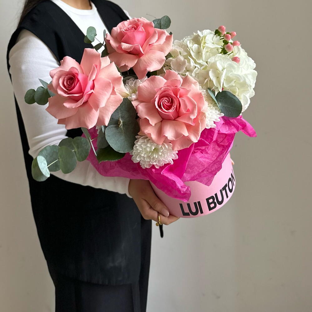 Это изысканное композиции из нежных цветов - роскошная кустовая хризантема, ароматный эвкалипт, три шикарные розы высотой 50 см и потрясающая гортензия Премиум Микс. Все они упакованы в стильную коробку, создавая гармоничное цветочное ансамбль, которое поразит своей красотой и изысканностью.