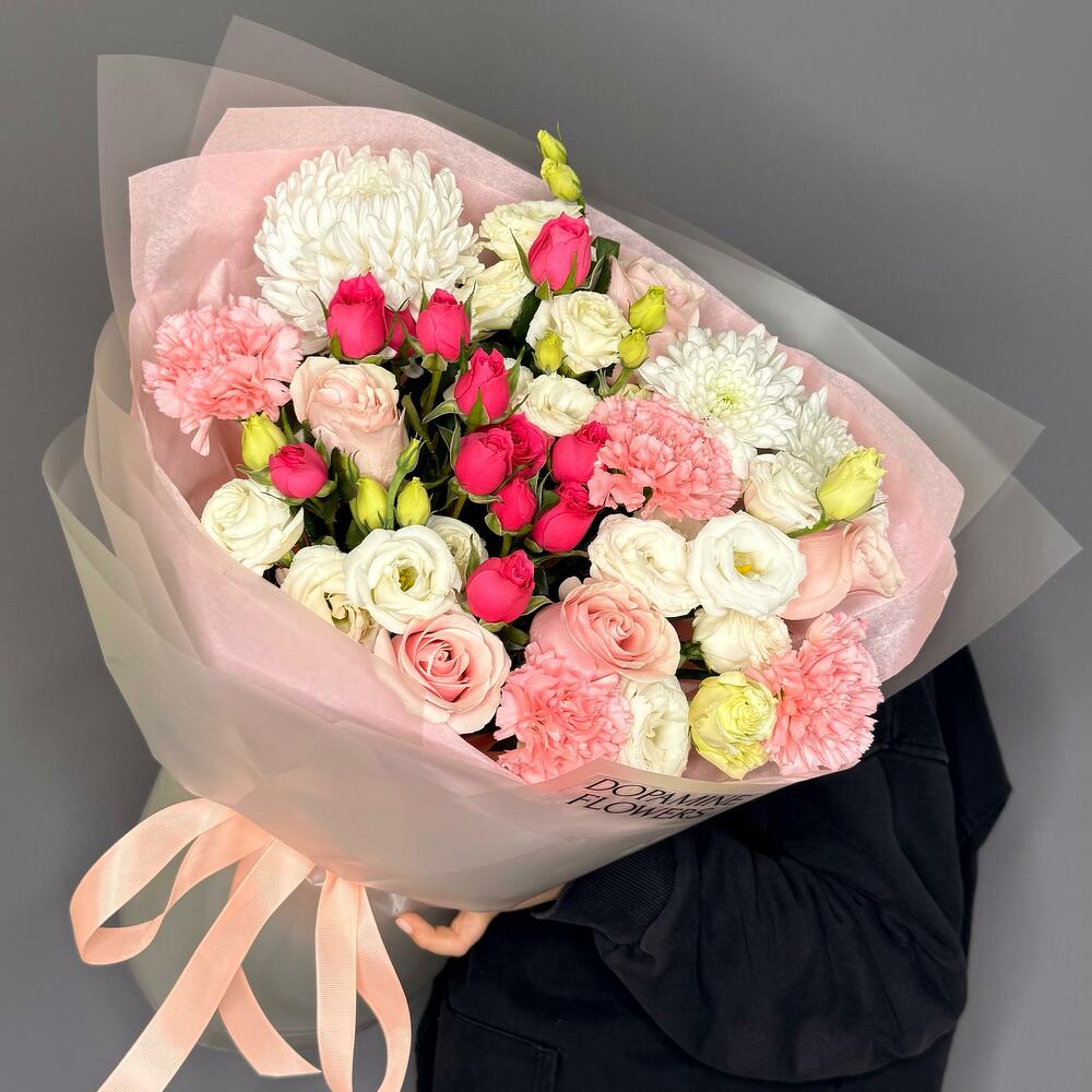 Раушан - 3 дана Эустома - 1 дана Диантус - 4 дана раушан бұта - 2 дана хризантема бұта - 1 дана 1 бигуди - 1 дана