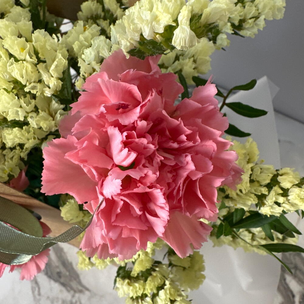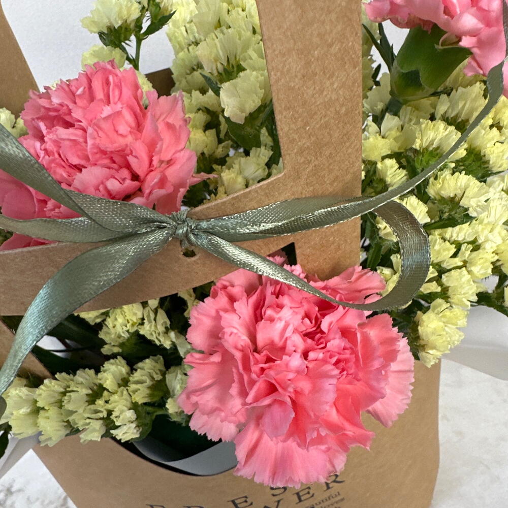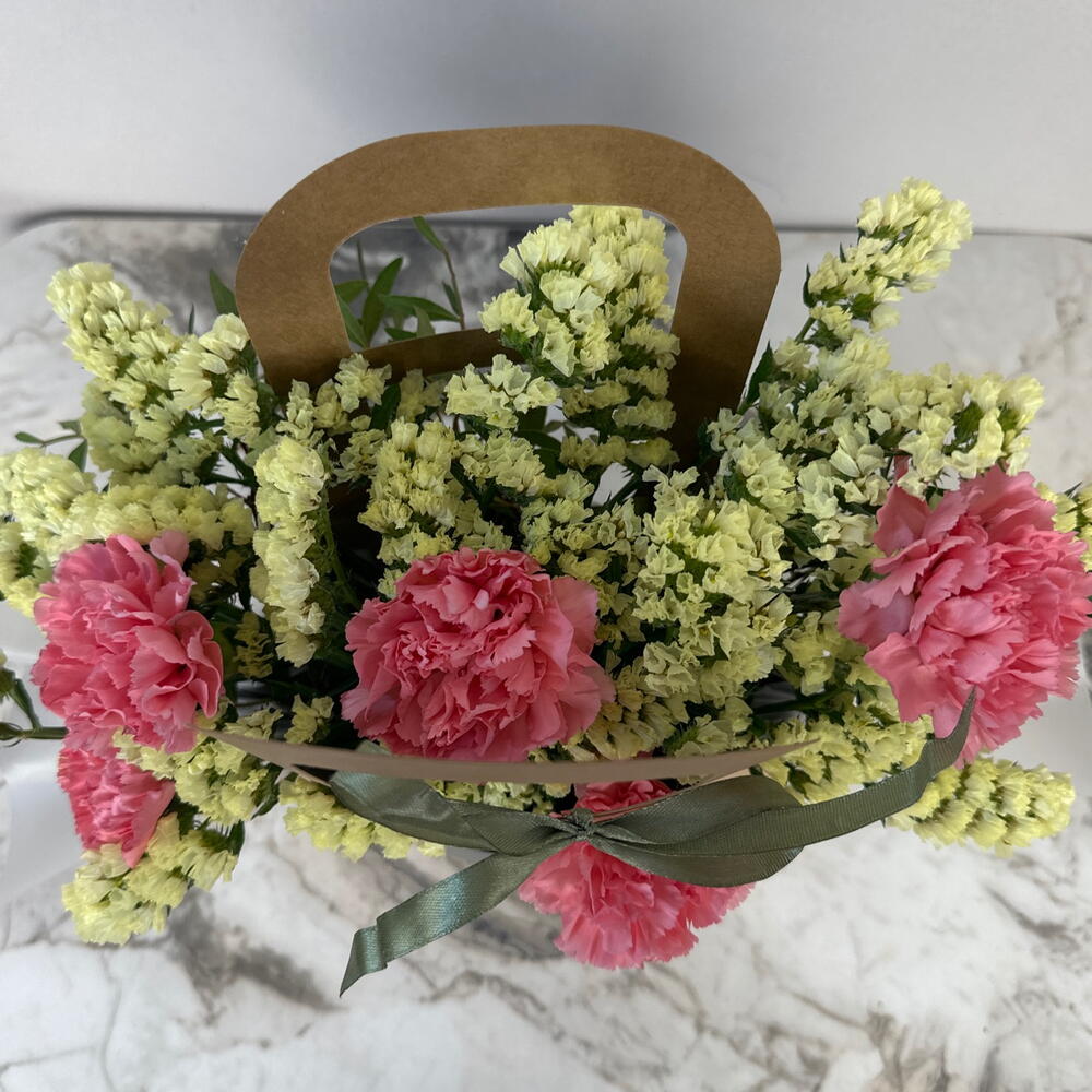 Атласты таспа - 1 дана Диантус - 5 дана Флористикалық Оазис - 1 дана статица ветка - 4 дана бумага пленка - 1 дана сумочка крафт картон - 1 дана