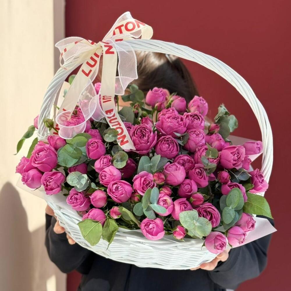 Композиция из кустовых пионовидных роз с эвкалиптом в корзине, наполненная теплом и заботой. Прекрасный способ сказать важные слова
