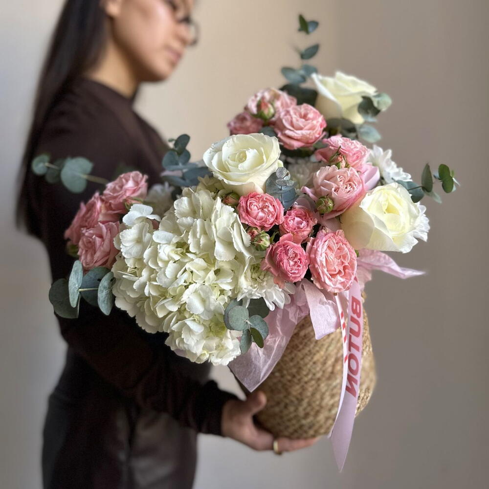 Сочетание деликатных оттенков создаёт спокойное, уютное настроение. Такая композиция подойдёт для семейных праздников, благодарности или тёплого поздравления