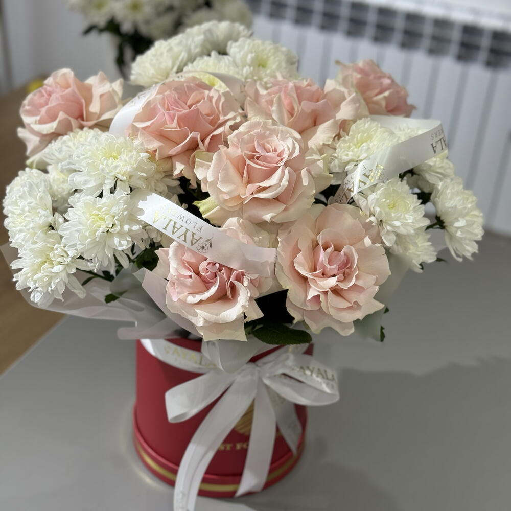Гүл композициясы «Зефиринка» Әрбір бөлшекте нәзіктік пен тәттілік! Осы талғампаз қорапта раушан гүлдері мен хризантемалар жиналған — олар махаббат пен қуаныштың белгілері. Бір мезетте қуанта да, таңғалдырғың келетін адамдарға арналған мінсіз сыйлық. Әрбір гүлдік үйлесім түс пен хош иістің гармониясын тудыратындай таңдалған, ал ұқыпты қорап композицияны стильді әрі беруге ыңғайлы етеді.