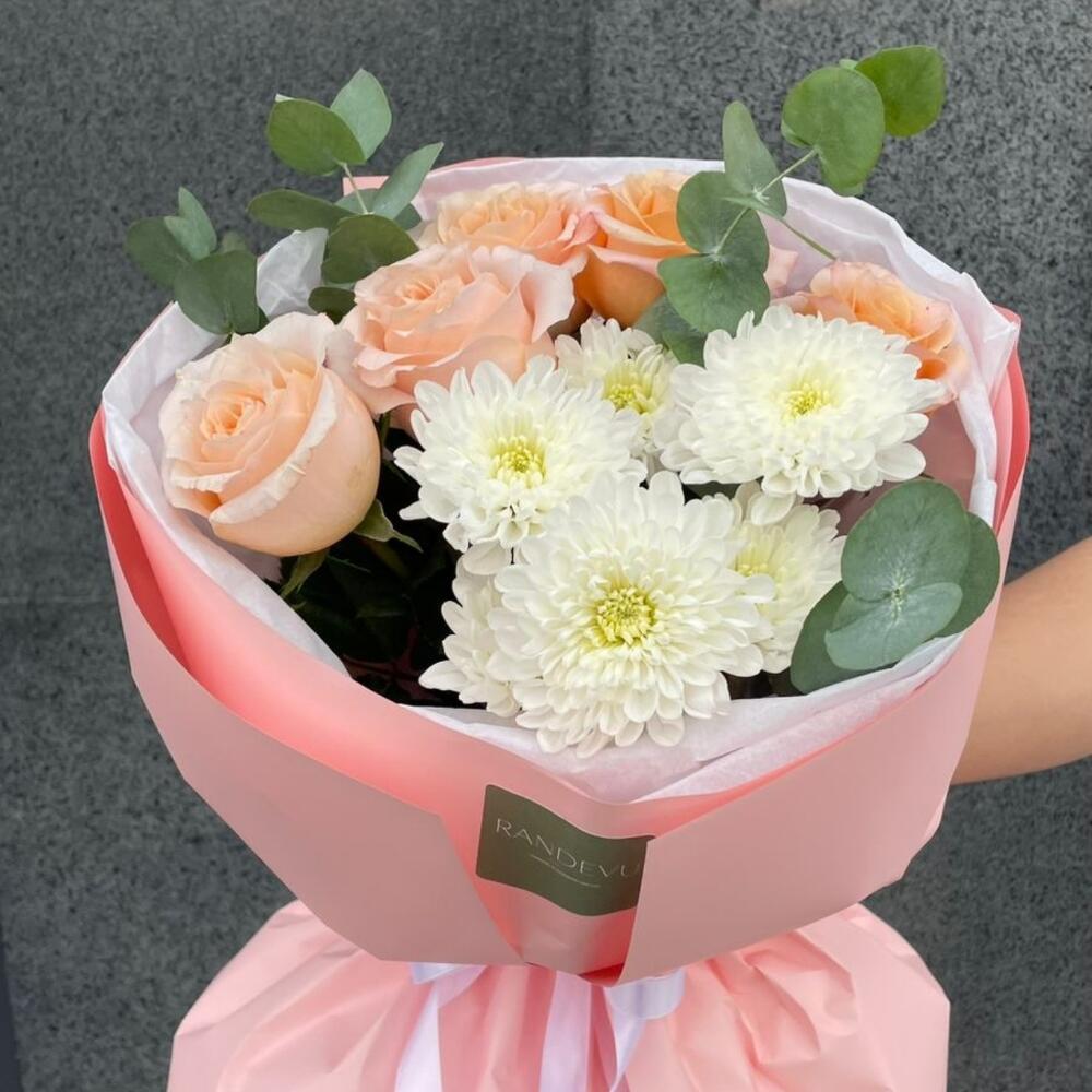 Хризантема бұтасы - 1 дана Эвкалипт - 1 дана Раушан - 5 дана Фоамиран (упаковка) - 3 дана Калька упаковка - 3 дана