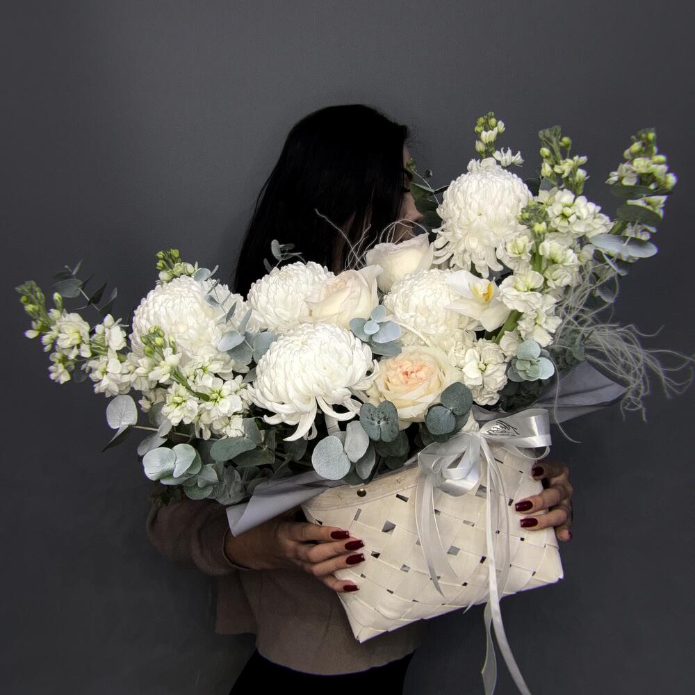 Маттиола - 9 дана Хризантема - 5 дана Роза пионовидная - 3 дана Фаленопсис - 1 дана