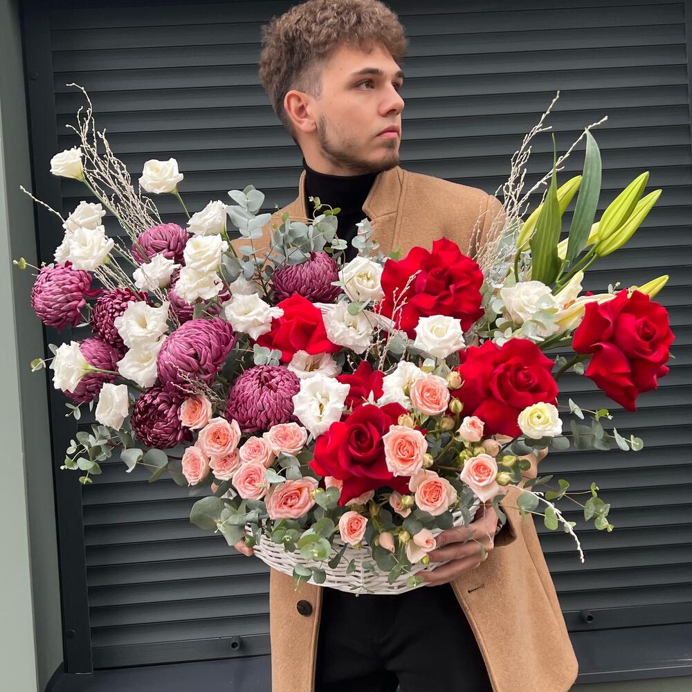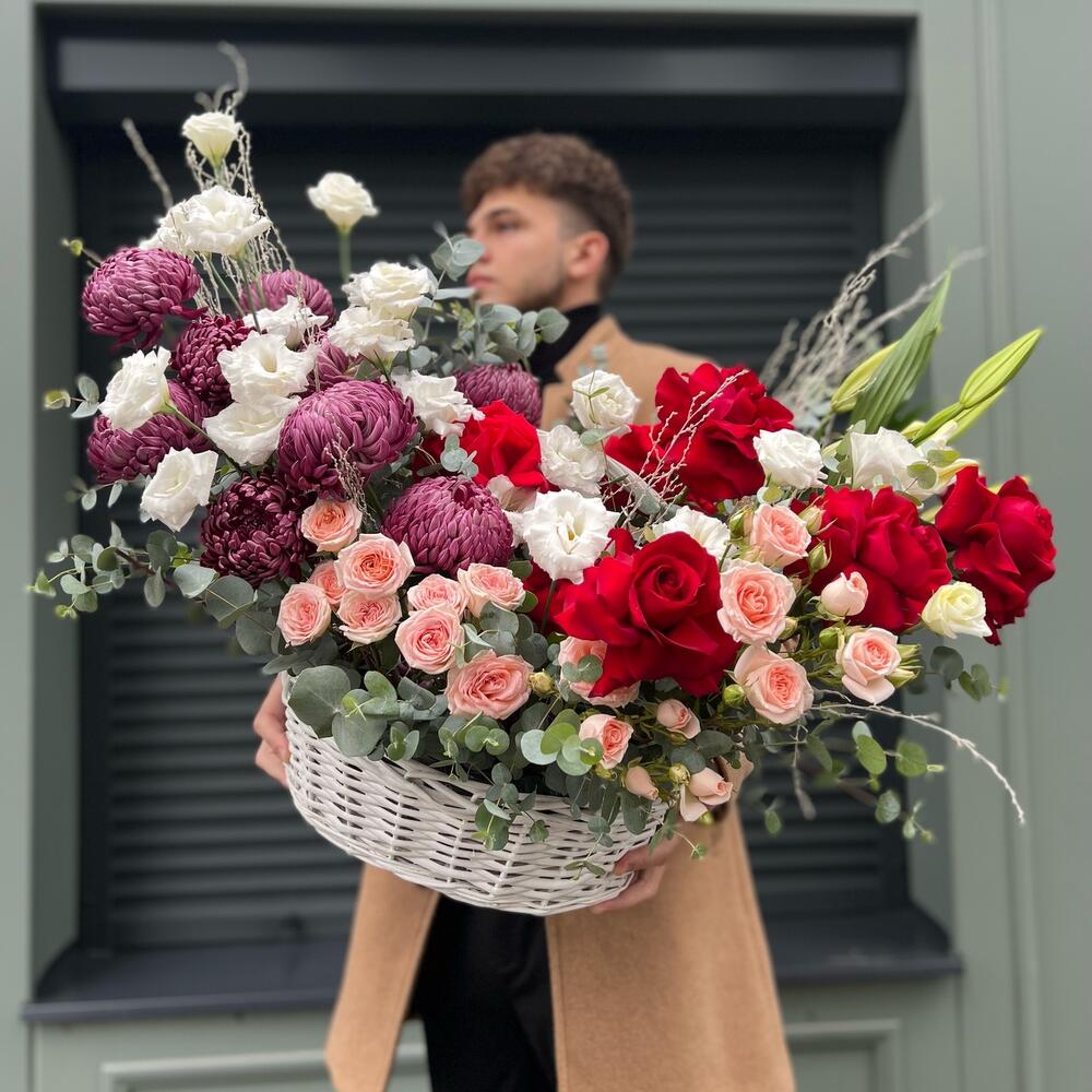 Лизиантус - 5 дана Лилия - 1 дана Эвкалипт - 5 дана Хризантема - 9 дана Себет өрілген - 1 дана Полынь - 5 дана Флористикалық Оазис - 4 дана Спрей роза - 5 дана раушан - 7 дана