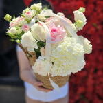 Лизиантус - 3 дана Гортензия белая - 1 дана Кашпо плетеное - 1 дана гвоздика розовая одноголовая - 5 дана розы кустовые розовые - 3 дана