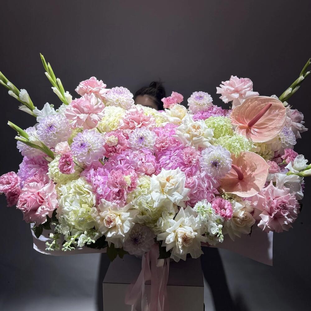 Антуриум - 2 дана Гортензия - 20 дана Маттиола - 10 дана Гвоздика - 10 дана Эустома - 15 дана Гладиолус - 5 дана Себет өрілген - 1 дана Дизайнерлік қаптама - 5 дана Кризал (жоғарғы киім) - 1 дана Флористикалық Оазис - 4 дана роза охара пионовидная - 10 дана георгина гүлдері - 10 дана