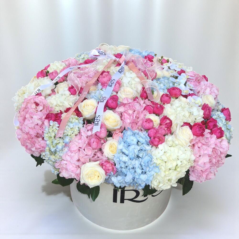 Роскошная цветочная композиция в стильной круглой коробке – это настоящий символ праздника и роскоши. Нежные оттенки розового, голубого, кремового и белого создают воздушное настроение и дарят ощущение утончённой гармонии. Гортензия придает объём и пышность, розы и пионовидные бутоны добавляют изысканности, а насыщенные малиновые акценты делают композицию выразительной. Такой подарок подчеркнёт важность момента и станет украшением любого торжества – от дня рождения до выпускного или свадьбы. Букет подарит море эмоций и станет настоящим центром внимания. Рекомендации по уходу: держите композицию вдали от прямых солнечных лучей и сквозняков, регулярно добавляйте воду в губку внутри коробки и обновляйте её каждые 2–3 дня.