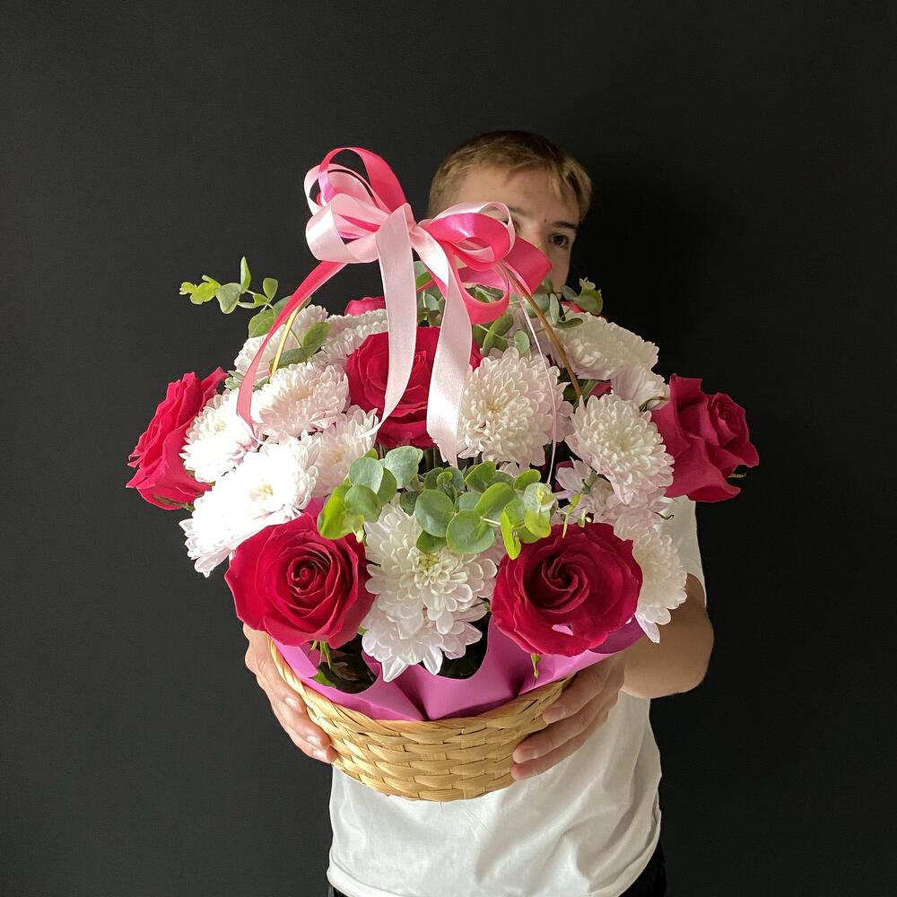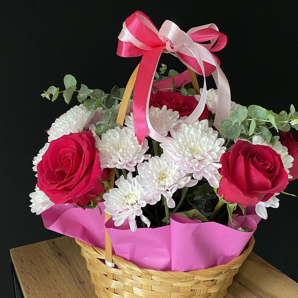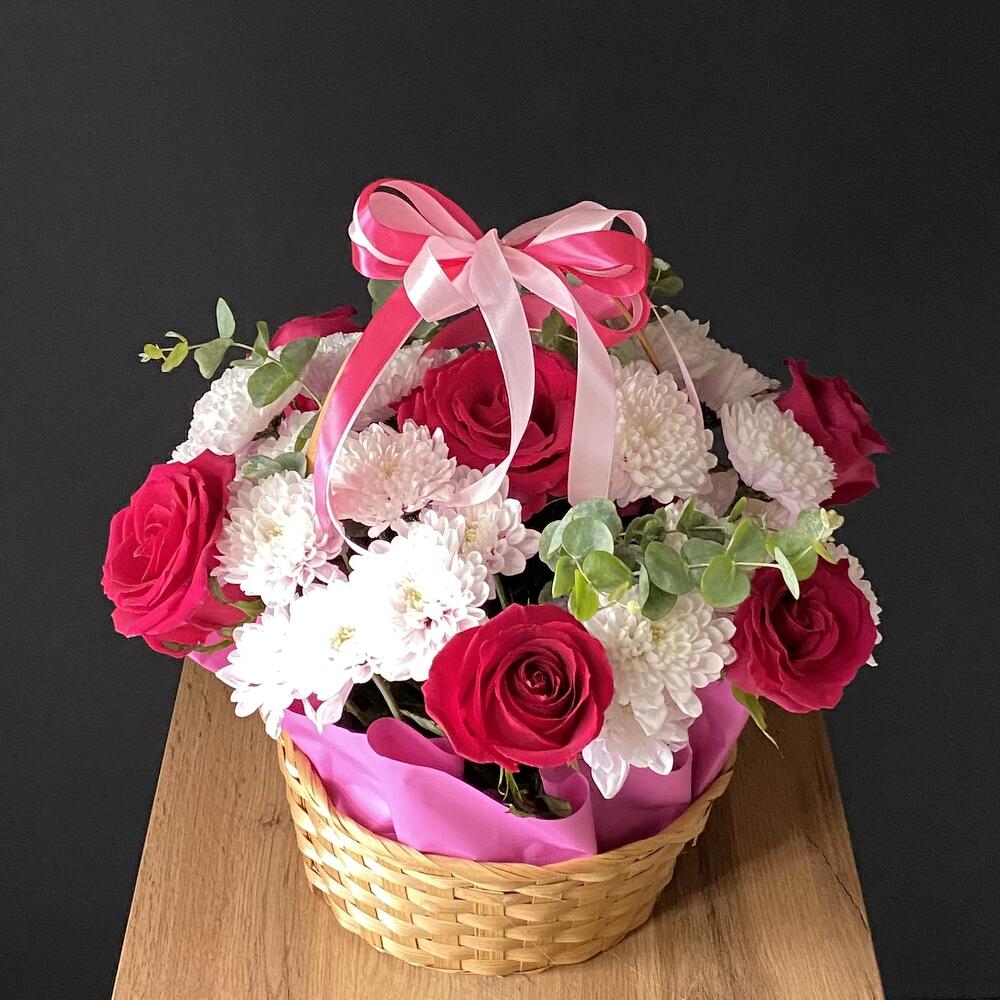 Хризантема бұтасы - 4 дана Эвкалипт - 3 дана Атласты таспа - 1 дана Себет өрілген - 1 дана Роза Pink Floyd - 7 дана Сіздің тілектеріңіз жазылған ашықхат - 1 дана Флористикалық Оазис - 1 дана