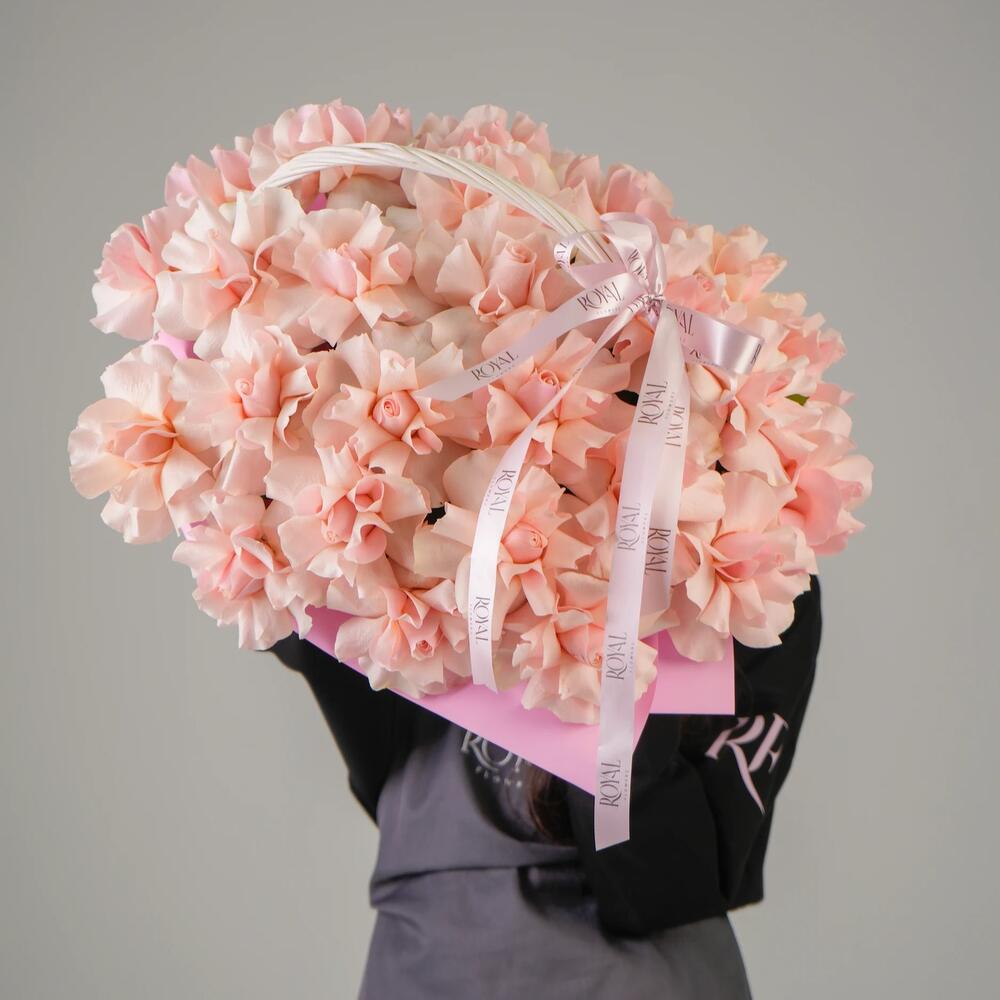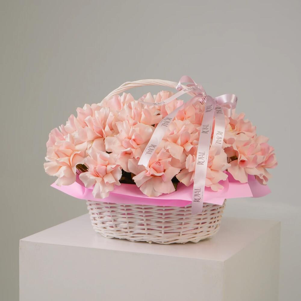 Нежная корзина из раскрытых голландских роз, наполнит вашу комнату теплым весенним настроением и создаст уютную атмосферу!