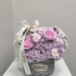 Нежная цветочная композиция в плетёной корзинке выглядит утонченно и по-настоящему дорого. Сочетание пышной гортензии, нежных роз и кустового диантуса в оттенках розового и сиреневого создаёт атмосферу уюта, романтики и лёгкости. Отлично подойдёт для любого повода.