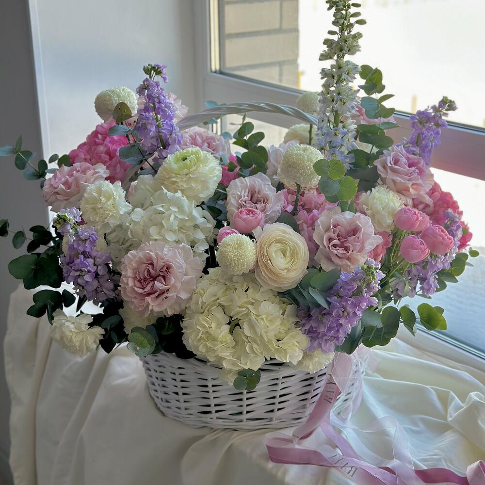 Гортензия - 7 дана дельфиниум - 2 дана Маттиола - 7 дана Раушан - 10 дана Бұта раушаны - 6 дана Хризантема - 10 дана Диантус - 10 дана Ранункулюс - 9 дана Эвкалипт Baby Blue - 10 дана
