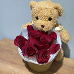 Қызыл раушан гүлдері мен плюш аюы бар себет