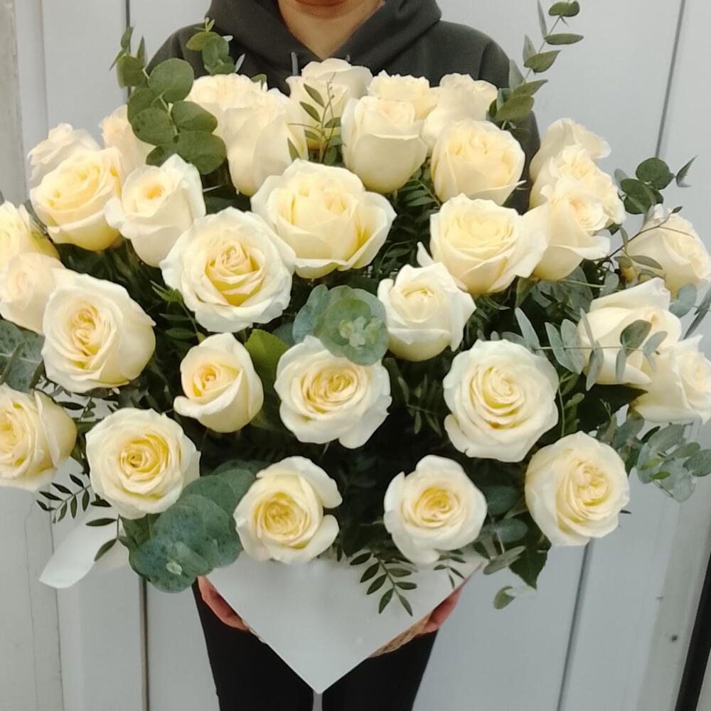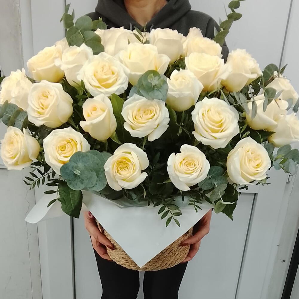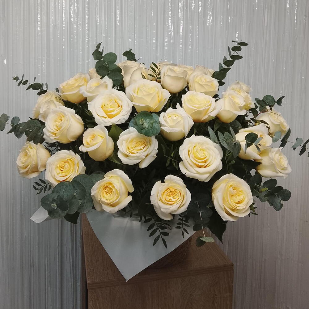 Кашпо - 1 дана Пионовидная роза - 35 дана Фисташка пучок - 1 дана Флористикалық Оазис - 2 дана Эвкалипт Цинерея - 2 дана бумага дизайнерская - 2 дана