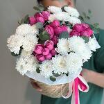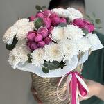 Эвкалипт - 5 дана Себет өрілген - 1 дана Флористикалық Оазис - 1 дана Спрей роза - 4 дана хризантемы кустовые - 3 дана