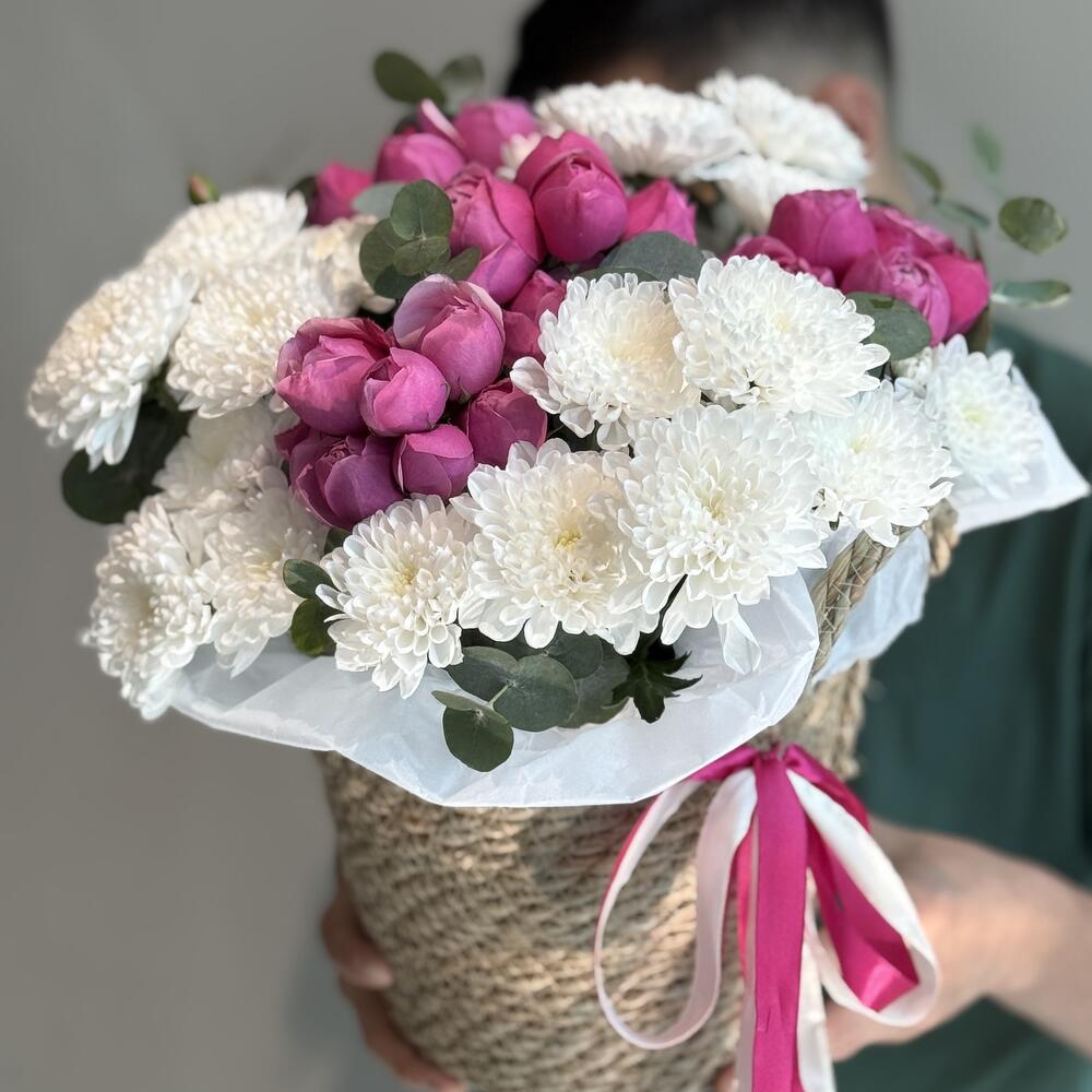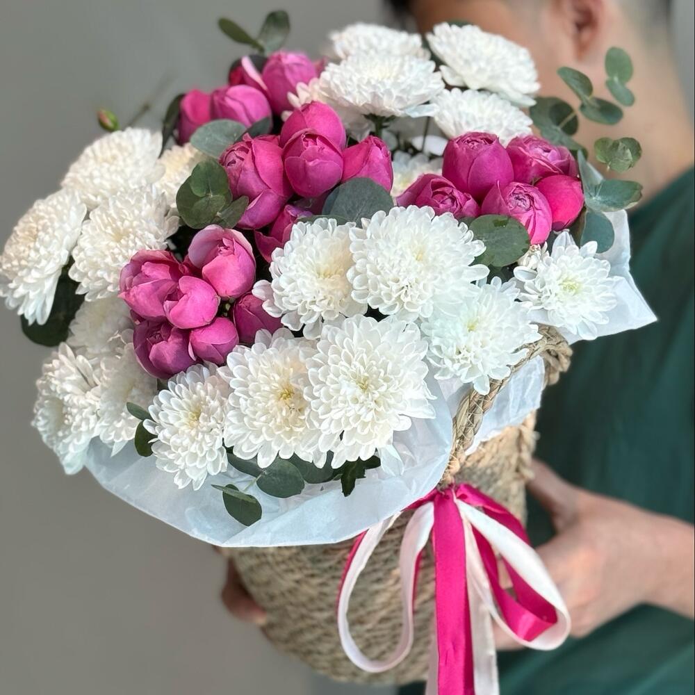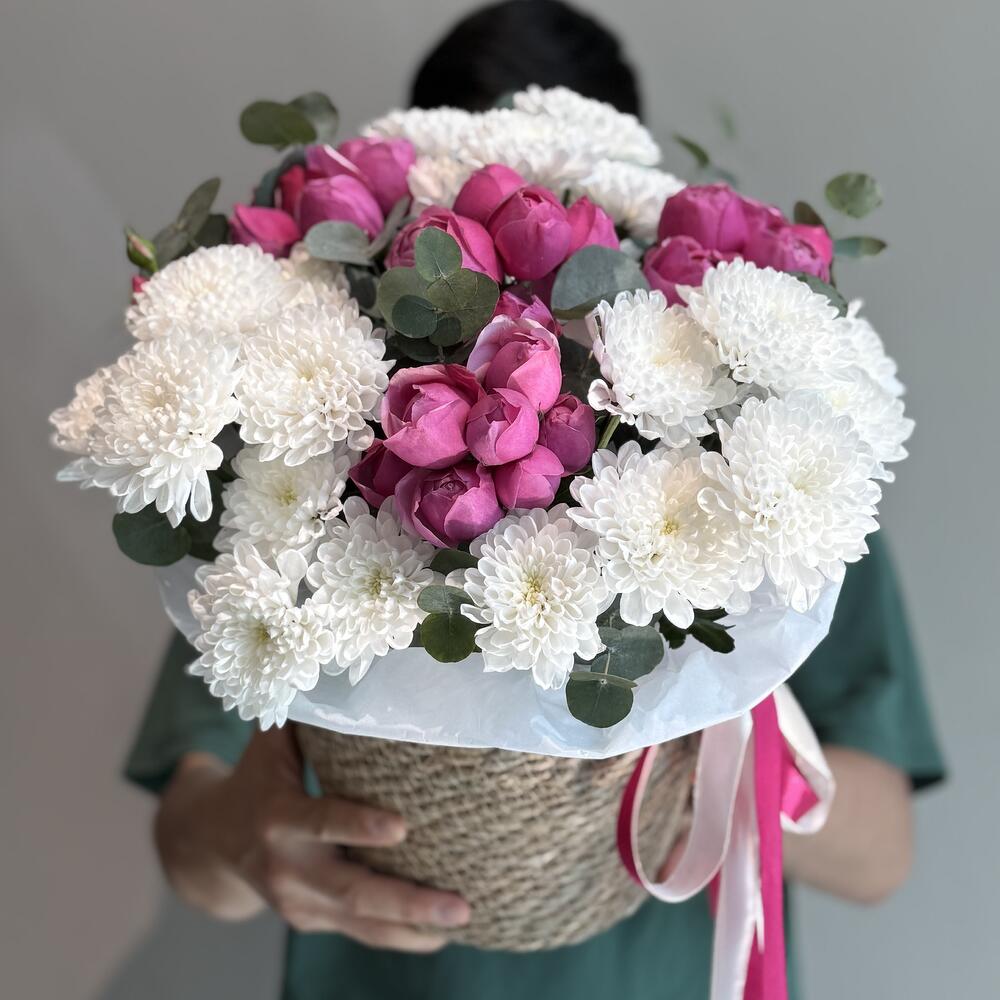 Эвкалипт - 5 дана Себет өрілген - 1 дана Флористикалық Оазис - 1 дана Спрей роза - 4 дана хризантемы кустовые - 3 дана