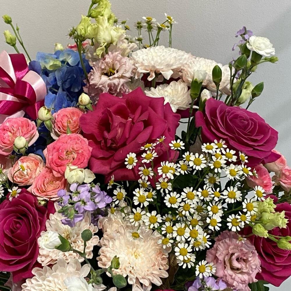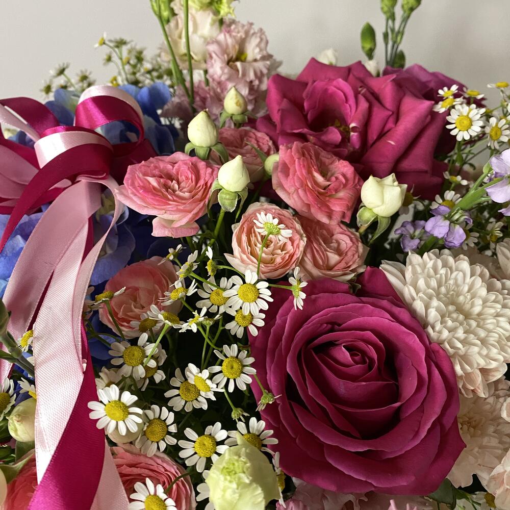 Гортензия - 1 дана Корзина - 1 дана Лизиантус - 3 дана Маттиола - 5 дана Писташ - 2 дана Бұта раушаны - 7 дана Танацетум - 3 дана Атласты таспа - 3 дана Диантус кустовой - 4 дана Сіздің тілектеріңіз жазылған ашықхат - 1 дана Флористикалық Оазис - 2 дана алтай хризантема - 2 дана