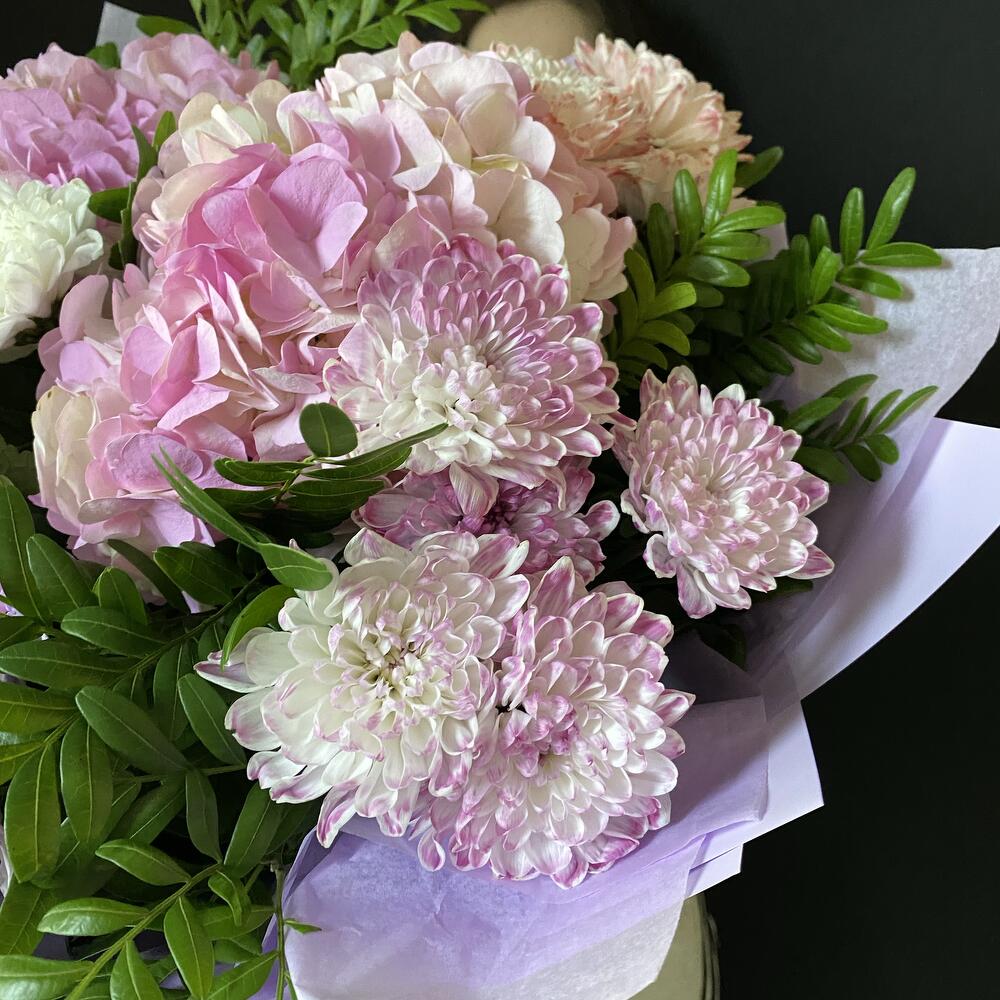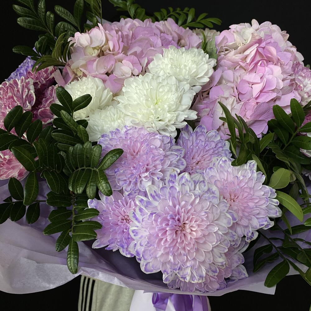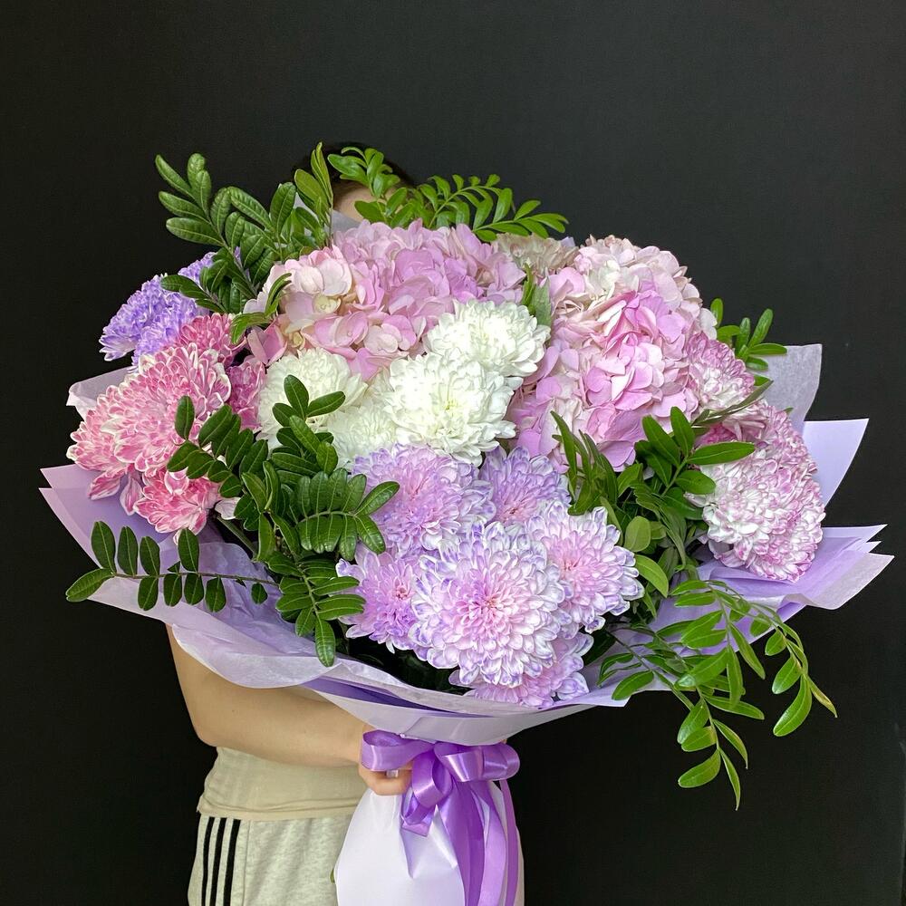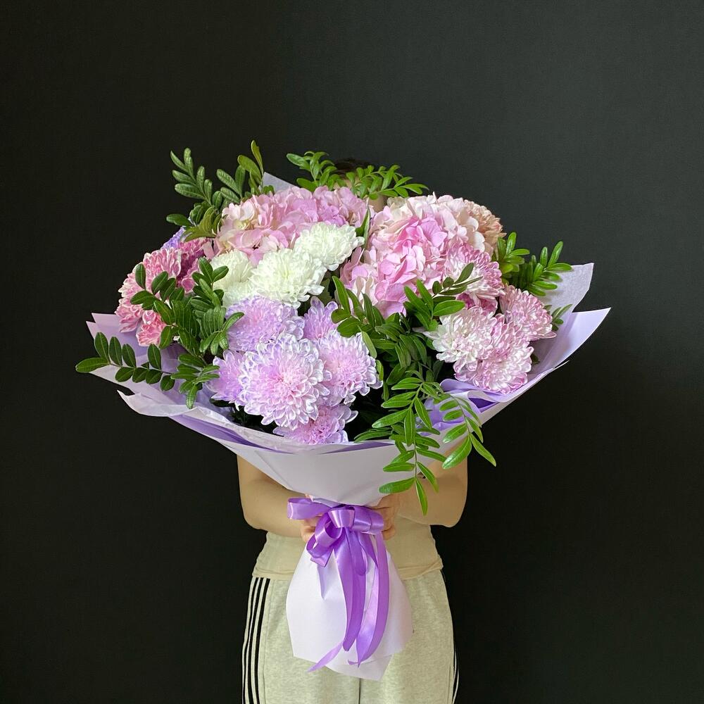 Гортензия - 2 дана Хризантема бұтасы - 6 дана Фисташка - 3 дана Дизайн күңгірт пленка - 1 дана сіздің тілектеріңізбен ашық хат - 1 дана