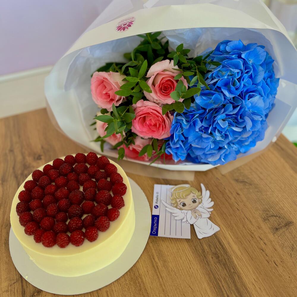 тортик малиновое облако - 650 гр. букет розы и альстромерии - 1 дана