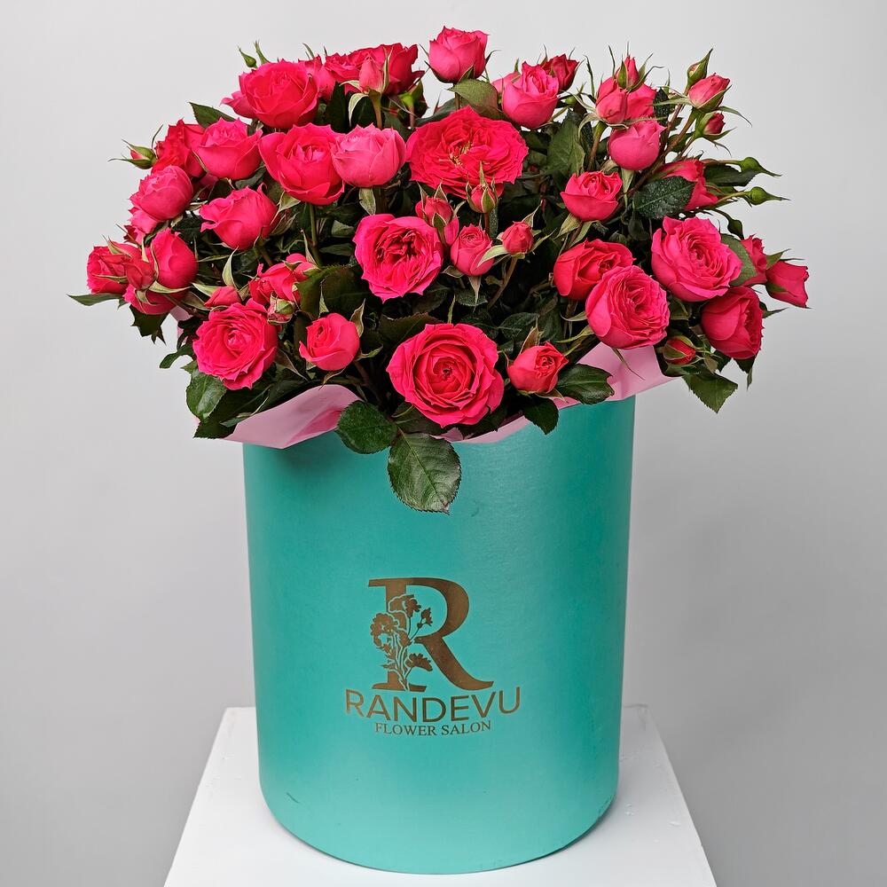 Этот яркий ансамбль из кустовых роз в стильной бирюзовой коробке — словно приглашение на праздник. Глубокий малиновый оттенок бутонов излучает страсть и уверенность, а свежая зелень добавляет гармонии. Контрастный цвет коробки делает композицию эффектной и современно дерзкой — идеальный подарок для тех, кто любит быть в центре внимания.