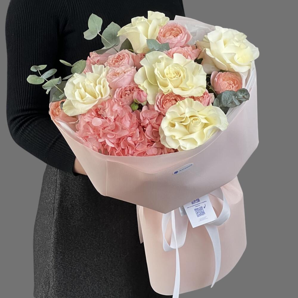 Нежный букет из гортензии, роз, спрей роз и эвкалипта.